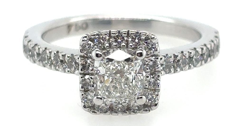 18CT WHITE GOLD DIAMOND RINGNew Piece Featuring A Cushion Brilliant Cut Diamond, Claw Set, 1.01Ct In Weight (5.97 X 5.43 X 3.67 Mm), Si2 In Clarity And G In Colour As Per Gia Report Number 1358826155. Report Number Is Laser Inscribed On Girdle Of Stone. 28 Round Brilliant Cut Diamonds, Set Around Centre Stone And In Shoulders Of Ring, 0.50Ct In Total Combined Weight, Vs In Clarity And F In Colour. Ring Is Finger Size QTotal Item Weight: 6.86gThis valuation has been conducted by an independent third-party professional. The valuation amount is an assessment by the issuing valuer and does not reflect the auction value of the item.Any inquiries regarding the valuation should be directed to the issuing valuer (refer to contact details on the certificate), as Lloyds Auctions has no affiliation or influence over the valuation, the valuer, or the stated amount.Insurance Replacement Valuation Amount: $22,500.00CROSSDOCK162827+7