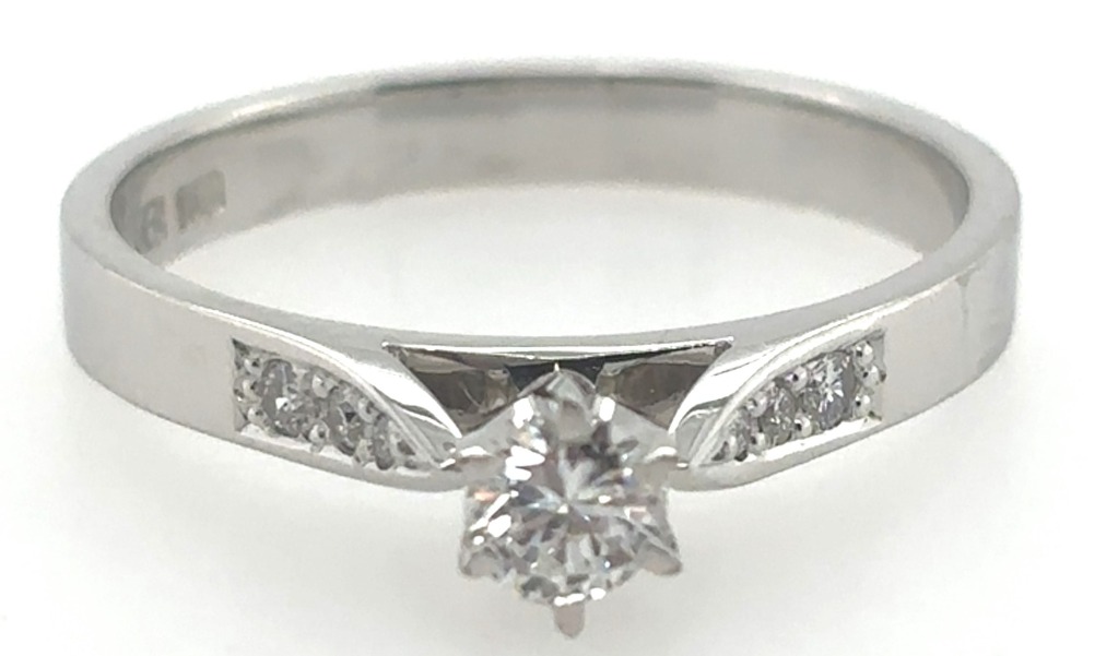 18CT HARDY BROTHERS WHITE GOLD DIAMOND RING Six Claw Set In A Tapering Collet Resting On An Underlying Band Is One Round Brilliant Cut Diamond, Measuring 3.72-3.95Mms Diameter, G Colour, Si1 Clarity, Calculated Weight 0.20Cts. Grain Set In Each Upswept Shoulder Are Three Round Brilliant Cut Diamonds, G-H Colour, Vs-Si Clarity, 1 X 0.02Cts, 1 X 0.01Cts, 1 X 200Pc, Total Calculated Weight For Both Shoulders 0.07Cts. The Flattish Band Measures 2.7Mms Wide At The Base, Developing Into Tapered, Upswept Shoulders Next To The Setting. New Piece. Total Item Weight: 3.78g Markings: Hb, 750 Condition: Good - Refer To Images This valuation has been conducted by an independent third-party professional. The valuation amount is an assessment by the issuing valuer and does not reflect the auction value of the item. Any inquiries regarding the valuation should be directed to the issuing valuer (refer to contact details on the certificate), as Lloyds Auctions has no affiliation or influence over the valuation, the valuer, or the stated amount. Insurance Replacement Valuation Amount: $2,575.00 CROSSDOCK 162827+19