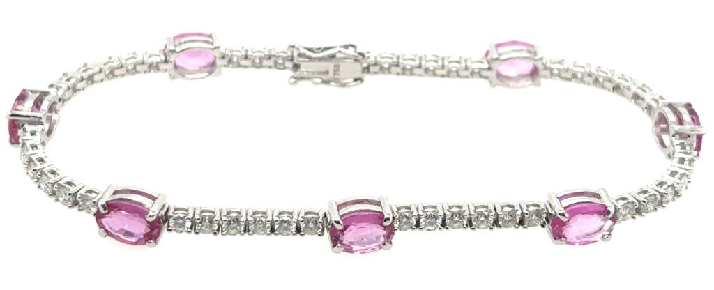 18CT WHITE GOLD DIAMOND AND SAPPHIRE TENNIS BRACELET New Piece Featuring 7 Oval Cut Sapphire, Claw Set, 8.10Ct In Total Combined Weight, And Pink In Colour. 47 Round Brilliant Cut Diamonds, Claw Set, 2.90Ct In Total Combined Weight, Vs In Clarity And G/H In Colour. Bracelet Has A Tongue And Groove Clasp With 2 Figure 8 Latches Total Item Weight: 10.56g Length: 18.00cm Markings: 750 Condition: Good - Refer To Images This valuation has been conducted by an independent third-party professional. The valuation amount is an assessment by the issuing valuer and does not reflect the auction value of the item. Any inquiries regarding the valuation should be directed to the issuing valuer (refer to contact details on the certificate), as Lloyds Auctions has no affiliation or influence over the valuation, the valuer, or the stated amount. Insurance Replacement Valuation Amount: $40,850.00 CROSSDOCK 162827+13