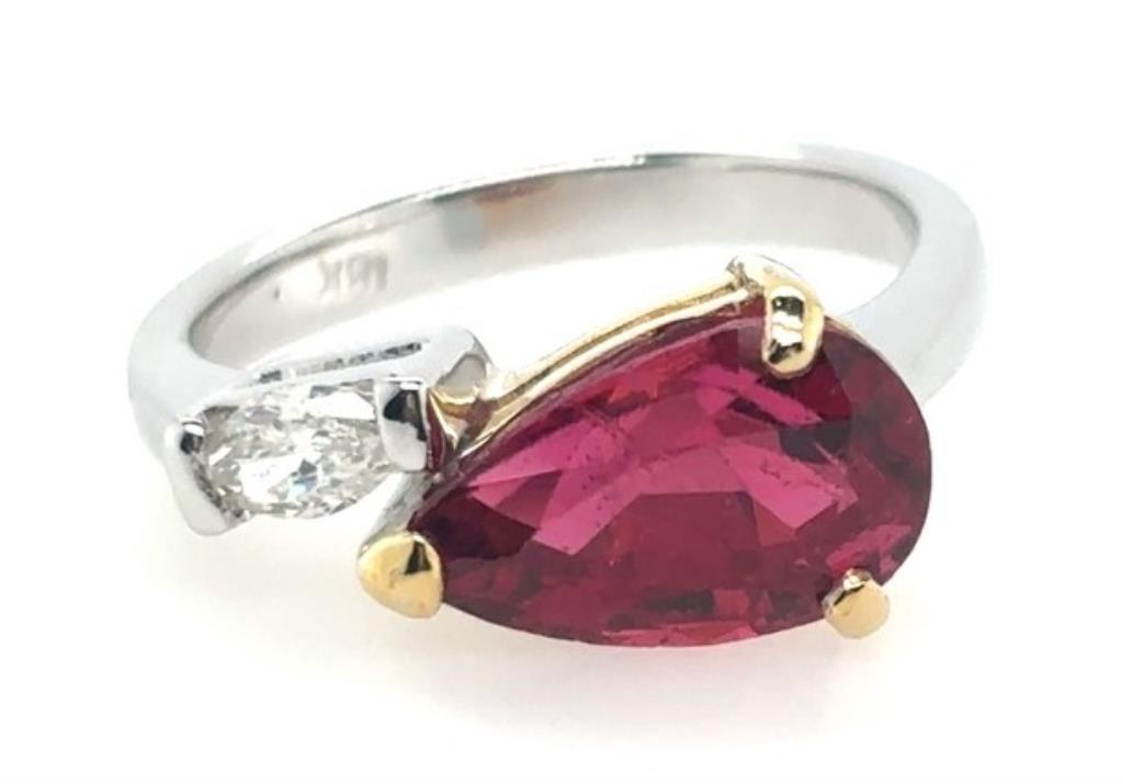18CT YELLOW AND WHITE GOLD RUBELLITE TOURMALINE AND DIAMOND RING Total Item Weight: 5.83gms Featuring A Pear Cut Rubellite Tourmaline, Claw Set, 3.75Ct In Weight (7.3 X 12Mm), And Pinkish Red In Colour. A Marquise Cut Diamond, Claw Set, 0.24Ct In Weight, Vs In Clarity And G In Colour. Ring Is Finger Size O1/2 Jewellery Valuations Provided By A Third Party Professional Not Directly Associated With Lloyds Auctions at AUD $19500 This Insurance Valuation has been provided by a registered Jewellery Valuer and is intended for insurance purposes only. The valuation amount has no bearing on the auction value of the item. Any questions regarding the valuation should be directed to the issuing Valuer (refer to contact details on the certificate) as Lloyds have no association or relationship with the Valuer or the valuation amount contained within the valuation. Condition: Excellent- Refer Images 0 162826+13 Crossdock
