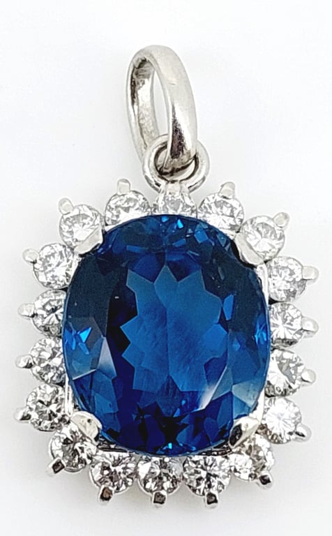 PLATINUM TOPAZ AND DIAMOND PENDANTThis Pendant Features One Oval Cut Topaz Set With Four Squared Claws, Surrounded By A Halo Of Eighteen Round Brilliant Cut Diamonds Set In End Claws To Give A Flower-Like Pattern, Articulating From A Rounded Oval Bail.Length: 26.00cmMarkings: Pt900Condition: Good - Refer To ImagesThis valuation has been conducted by an independent third-party professional. The valuation amount is an assessment by the issuing valuer and does not reflect the auction value of the item.Any inquiries regarding the valuation should be directed to the issuing valuer (refer to contact details on the certificate), as Lloyds Auctions has no affiliation or influence over the valuation, the valuer, or the stated amount.Insurance Replacement Valuation Amount: $10,620.00CROSSDOCK162949+23