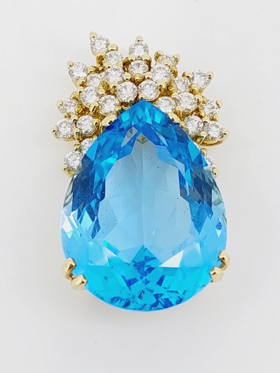 14K YELLOW GOLD TOPAZ AND DIAMOND PENDANTThe Pear Shaped Blue Topaz Is Set In A Double & Single Claw Basket Setting With A Spray Of Round Brilliant Cut Diamonds At The Top, And A Hidden Fixed Yellow Gold Bail.Total Item Weight: 21.74gCondition: Good - Refer To ImagesThis valuation has been conducted by an independent third-party professional. The valuation amount is an assessment by the issuing valuer and does not reflect the auction value of the item.Any inquiries regarding the valuation should be directed to the issuing valuer (refer to contact details on the certificate), as Lloyds Auctions has no affiliation or influence over the valuation, the valuer, or the stated amount.Insurance Replacement Valuation Amount: $15,600.00CROSSDOCK162949+24
