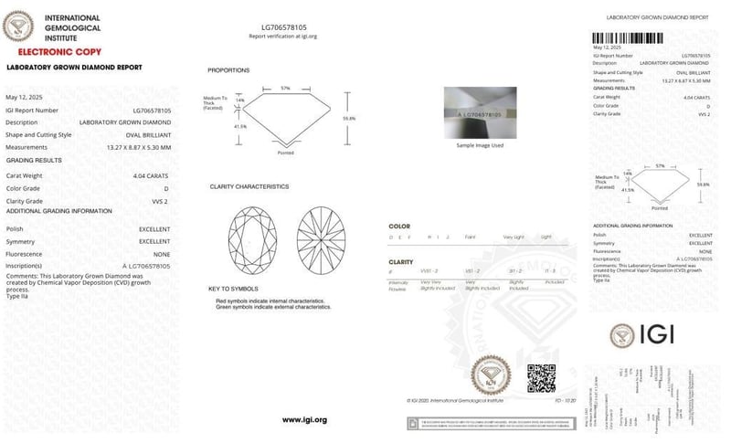 Igi Certificate # Lg 706578105 Laser Inscribed : Labgrown Igi Lg 706578105 Polish : Excellent Symmetry : Excellent Flourescence : None Type : Cvd