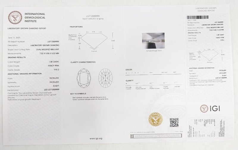 1.08CT IGI CERTIFIED PINK LAB GROWN DIAMOND Shape And Cutting Style: Oval Modified Brilliant Colour Grade: Fancy Pink Clarity Grade: Vvs 2 Polish: Excellent Symmetry: Excellent Dimensions: Height: 7.52mm, Width: 5.55mm, Depth: 3.32mm 584109+8