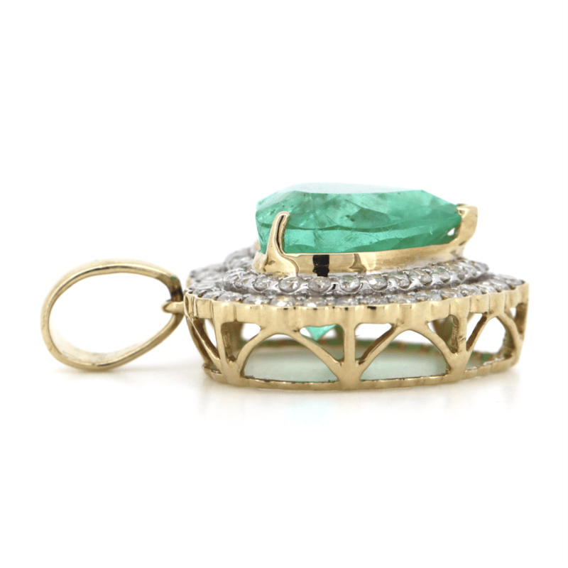 14K YELLOW GOLD, 6.15CT COLOMBIAN EMERALD AND DIAMOND, DOUBLE HALO STATEMENT PENDANT. The Centre Features, One Heart Shape Cut, Medium Bluish-Green, Colombian Emerald (6.15Ct, Moderate Eye Visible Inclusions), V Prong/Claw Set. Surrounding The Centre In A Double Halo Are, 63 Round Brilliant Cut, Diamonds (0.86Ct Tdw, J-K Colour, Si2-I2 Clarity), Set In White Gold, Semi Bezel, Bead Set. Condition: New. 14K Yellow Gold, 6.15Ct Colombian Emerald And Diamond, Double Halo Statement Pendant. The Centre Features, One Heart Shape Cut, Medium Bluish-Green, Colombian Emerald (6.15Ct, Moderate Eye Visible Inclusions), V Prong/Claw Set. Surrounding The Centre In A Double Halo Are, 63 Round Brilliant Cut, Diamonds (0.86Ct Tdw, J-K Colour, Si2-I2 Clarity), Set In White Gold, Semi Bezel, Bead Set. Condition: New. Valuations Provided by an Independent Third-Party Professional Not Directly Associated With Lloyds Auctions at AUD $$44,890.00This valuation has been conducted by an independent third-party professional. The valuation amount is an assessment by the issuing valuer and does not reflect the auction value of the item. Any inquiries regarding the valuation should be directed to the issuing valuer (refer to contact details on the certificate), as Lloyds Auctions has no affiliation or influence over the valuation, the valuer, or the stated amount. Condition: Good - Refer Images 0645838+5305