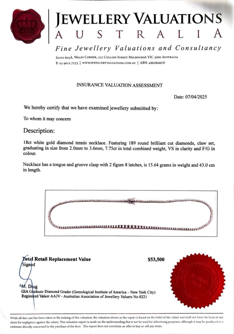 New Piece Featuring 189 Round Brilliant Cut Diamonds, Claw Set, Graduating In Size From 2.0Mm To 3.6Mm, 7.75Ct In Total Combined Weight, Vs In Clarity And F/G In Colour. Necklace Has A Tongue And Groove Clasp With 2 Figure 8 Latches