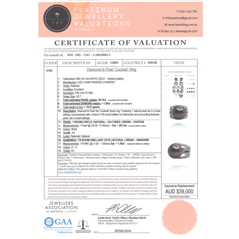 14K White Gold, Black Cultured Tahitian Pearl And Diamond, Cocktail Ring. The Centre Features, One Round, Black, Cultured Tahitian Pearl (16.50Mm-17.00Mm Size, Blemishes), Cap Set. Encompassing The Design Are, 118 Round Brilliant Cut, Diamonds (1.59Ct Tdw, G-H Colour, Si1 Clarity), Bead Set. Ring Size N 1/2.