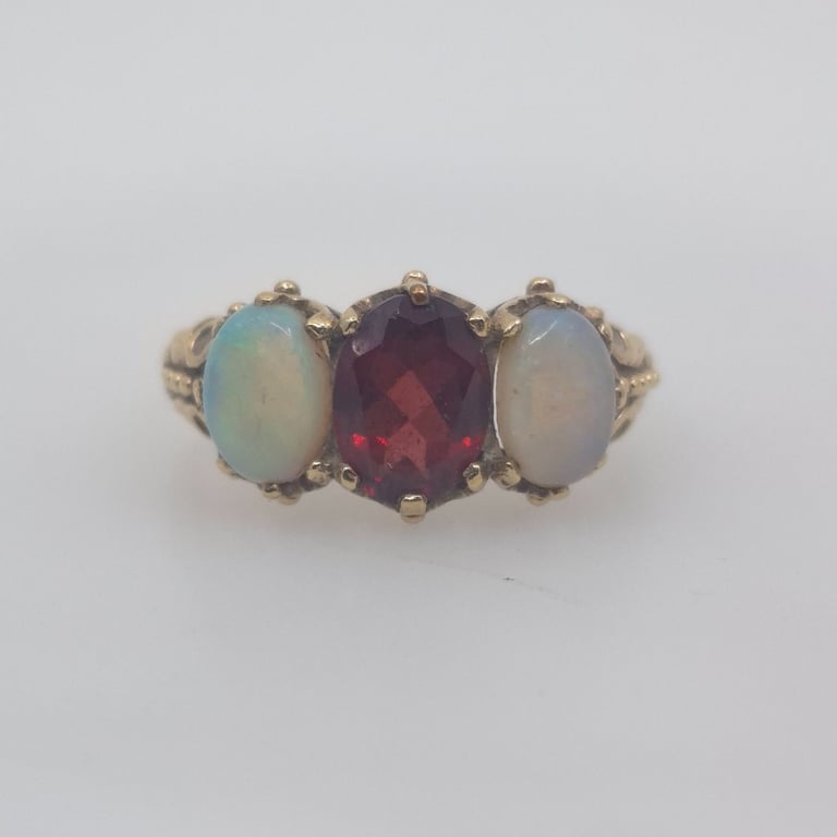 9CT GOLD RING WITH 1 ALAMANDINE AQUAMARINE EMERALD & 2 OPALS Total Item Weight: 3.19g Markings: 375 Condition: Good - Refer To Images VAULT 586134+4