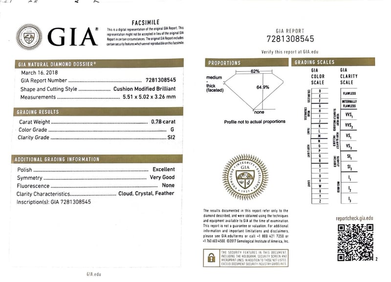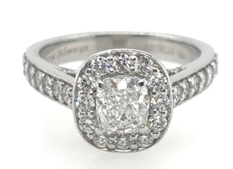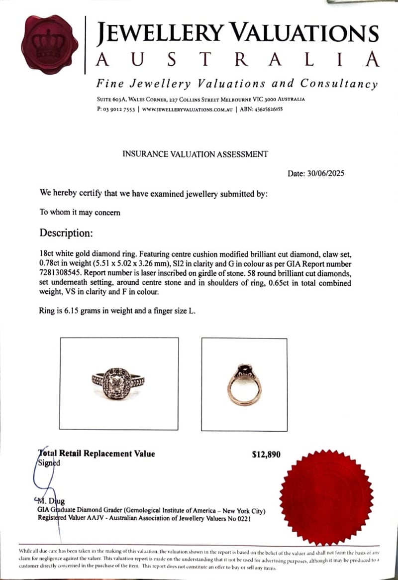 18CT WHITE GOLD DIAMOND RING Total Item Weight: 6.15gms Featuring Centre Cushion Modified Brilliant Cut Diamond, Claw Set, 0.78Ct In Weight (5.51 X 5.02 X 3.26 Mm), Si2 In Clarity And G In Colour As Per Gia Report Number 7281308545. Report Number Is Laser Inscribed On Girdle Of Stone. 58 Round Brilliant Cut Diamonds, Set Underneath Setting, Around Centre Stone And In Shoulders Of Ring, 0.65Ct In Total Combined Weight, Vs In Clarity And F In Colour. Ring Is Finger Size L Jewellery Valuations Provided By A Third Party Professional Not Directly Associated With Lloyds Auctions at AUD $12890This Insurance Valuation has been provided by a registered Jewellery Valuer and is intended for insurance purposes only. The valuation amount has no bearing on the auction value of the item. Any questions regarding the valuation should be directed to the issuing Valuer (refer to contact details on the certificate) as Lloyds have no association or relationship with the Valuer or the valuation amount contained within the valuation. Condition: Excellent- Refer Images 0162826+10Crossdock