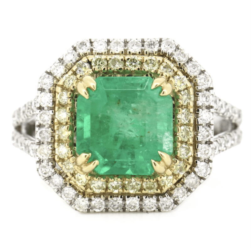 14K YELLOW GOLD, 2.32CT COLOMBIAN EMERALD AND DIAMOND, DOUBLE HALO RING. The Centre Features, One Emerald Cut, Light Moderate Green, Colombian Emerald (2.32Ct, Slight-Moderately Included), Double 4 Claw Set. Surrounding The Centre In A Double Halo Are, 64 Round Brilliant Cut, Diamonds (0.38Ct Tdw, H-K Colour, Si1-Si2 Clarity), Micro-Bead Set In White Gold. Ring Size M. Condition: New 14K Yellow Gold, 2.32Ct Colombian Emerald And Diamond, Double Halo Ring. The Centre Features, One Emerald Cut, Light Moderate Green, Colombian Emerald (2.32Ct, Slight-Moderately Included), Double 4 Claw Set. Surrounding The Centre In A Double Halo Are, 64 Round Brilliant Cut, Diamonds (0.38Ct Tdw, H-K Colour, Si1-Si2 Clarity), Micro-Bead Set In White Gold. Ring Size M. Condition: New Valuations Provided by an Independent Third-Party Professional Not Directly Associated With Lloyds Auctions at AUD $$46,000.00This valuation has been conducted by an independent third-party professional. The valuation amount is an assessment by the issuing valuer and does not reflect the auction value of the item. Any inquiries regarding the valuation should be directed to the issuing valuer (refer to contact details on the certificate), as Lloyds Auctions has no affiliation or influence over the valuation, the valuer, or the stated amount. Condition: Good - Refer Images 0645838+5369