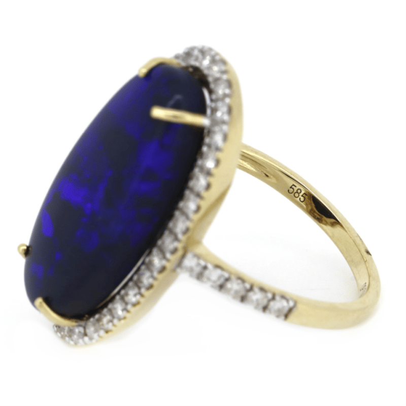 The Centre Features, One Oval Cabochon Cut, Australian Lightning Ridge Opal (7.94Ct, Deep Indigo Blue Colour Play, Limited-Slight Inclusions), Claw Set. Surrounding The Centre In A Halo And Decorating Shoulders Are, 44 Round Brilliant Cut, Diamonds (0.60Ct Tdw, G-H Colour, Si1-Si2 Clarity), Semi-Bezel/Bead Set In Yellow Gold. Ring Size N 1/2. Condition: New.