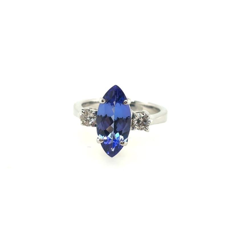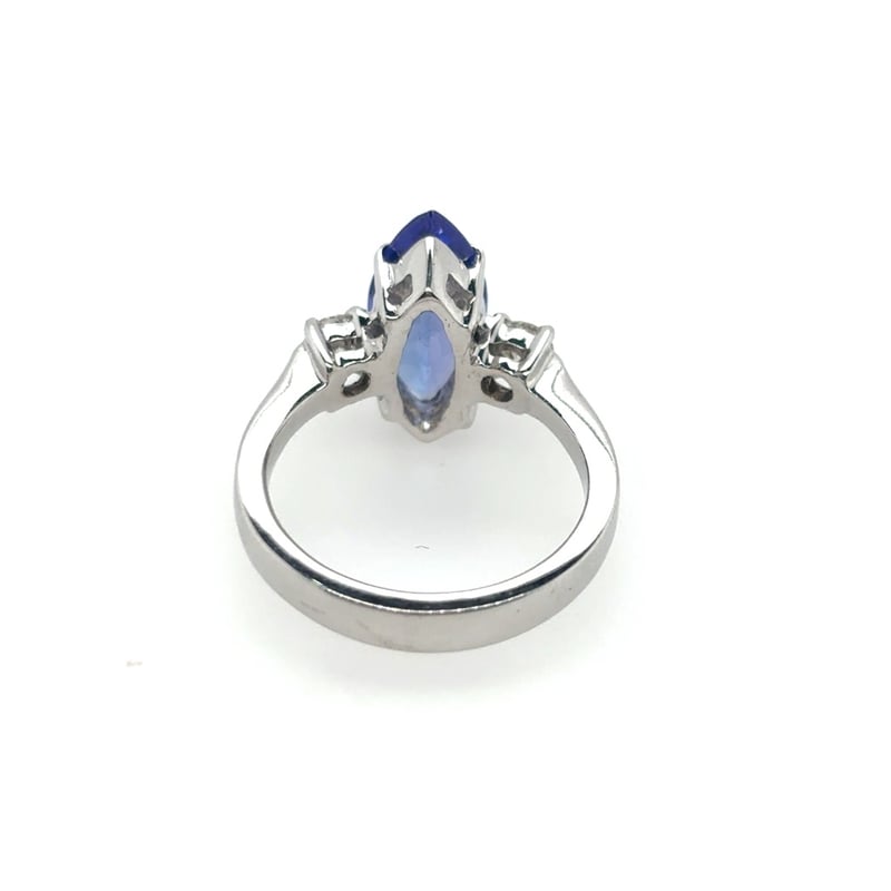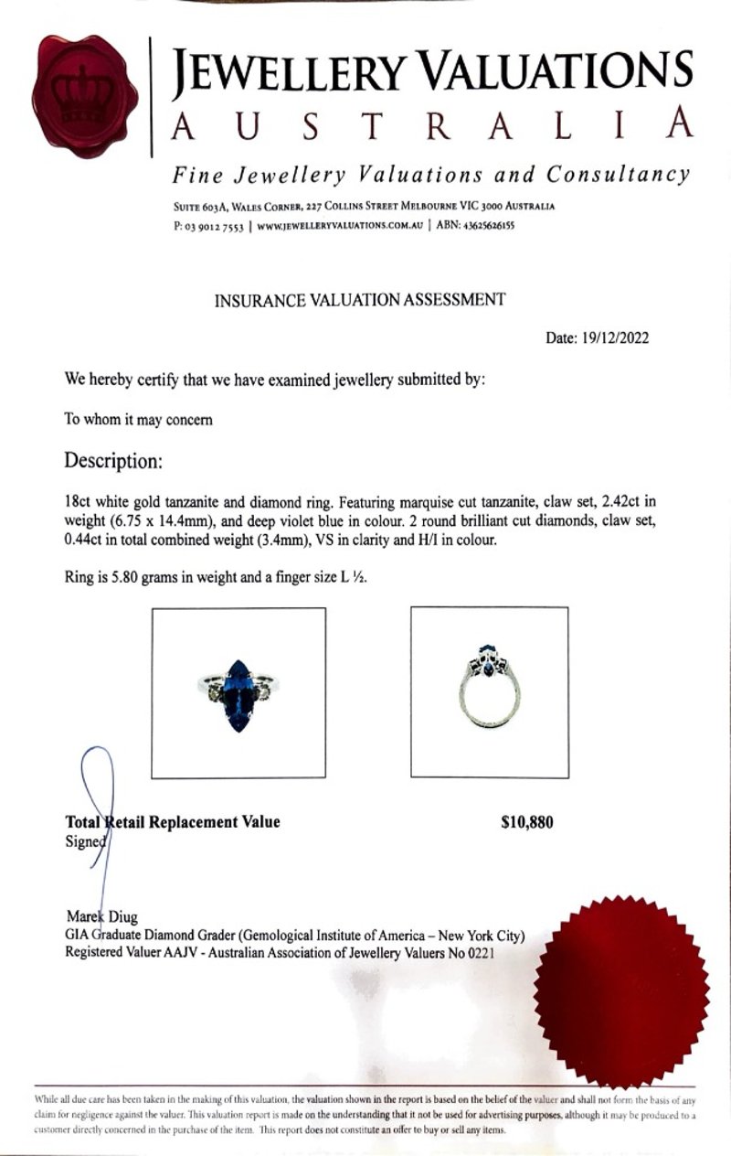 18CT WHITE GOLD TANZANITE AND DIAMOND RING Total Item Weight: 5.8gms Featuring Marquise Cut Tanzanite, Claw Set, 2.42Ct In Weight (6.75 X 14.4Mm), And Deep Violet Blue In Colour. 2 Round Brilliant Cut Diamonds, Claw Set, 0.44Ct In Total Combined Weight (3.4Mm), Vs In Clarity And H/I In Colour. Ring Is Finger Size L 1/2 Jewellery Valuations Provided By A Third Party Professional Not Directly Associated With Lloyds Auctions at AUD $10880This Insurance Valuation has been provided by a registered Jewellery Valuer and is intended for insurance purposes only. The valuation amount has no bearing on the auction value of the item. Any questions regarding the valuation should be directed to the issuing Valuer (refer to contact details on the certificate) as Lloyds have no association or relationship with the Valuer or the valuation amount contained within the valuation. Condition: Excellent- Refer Images 0162826+16Crossdock