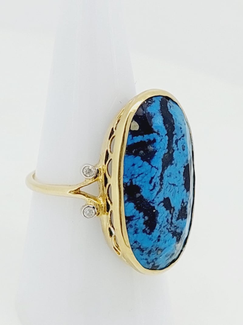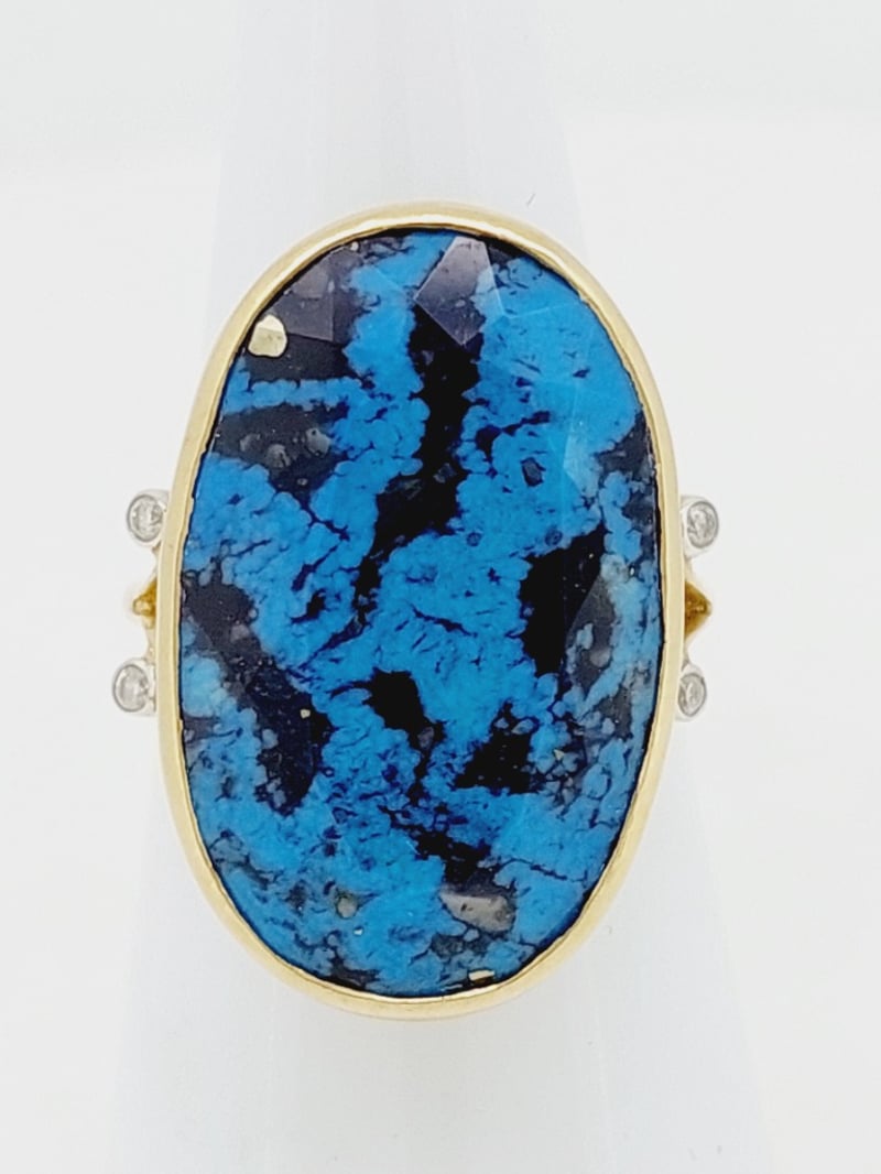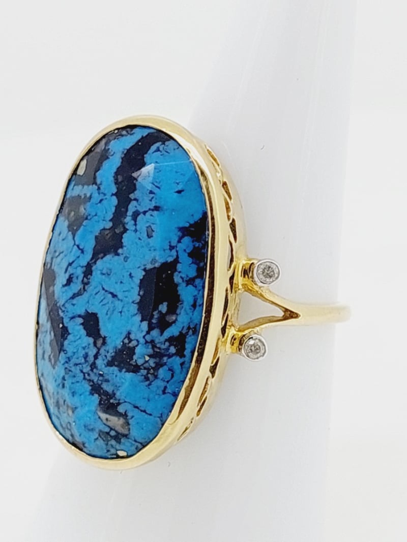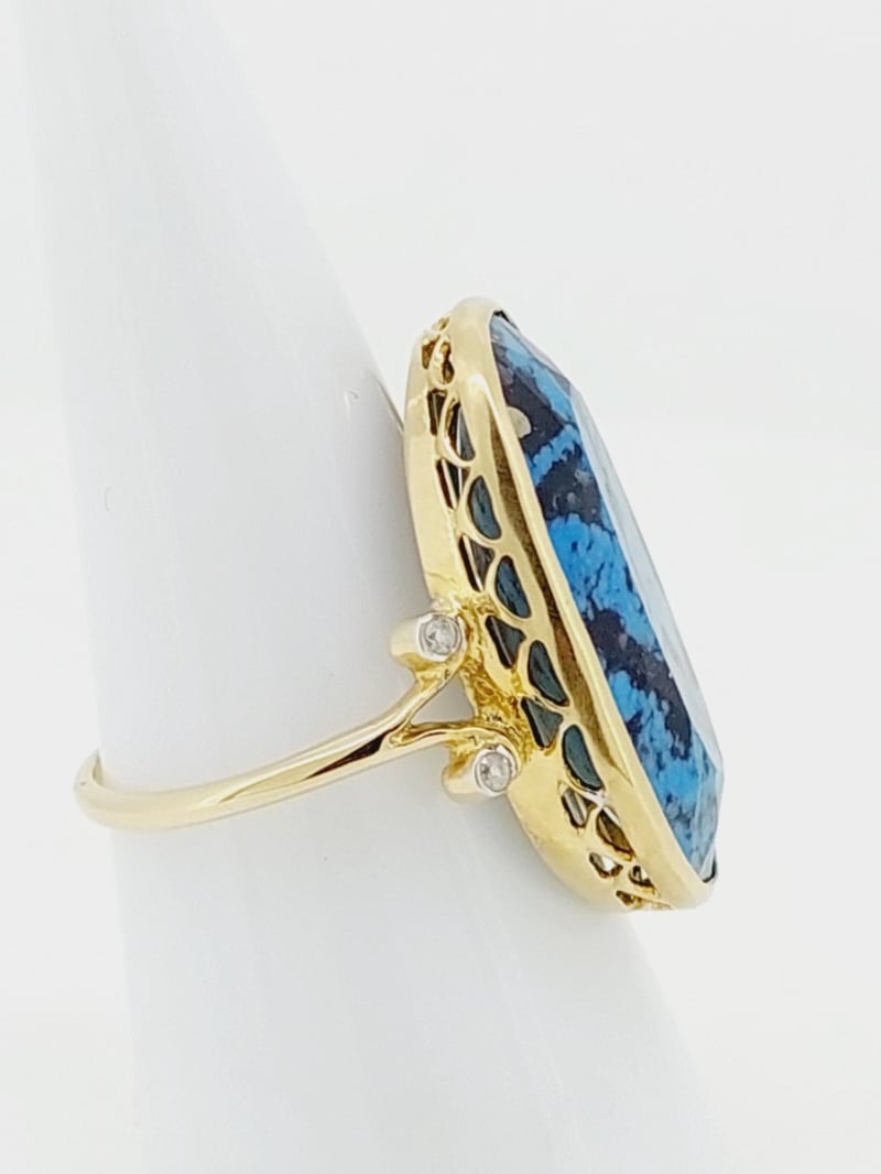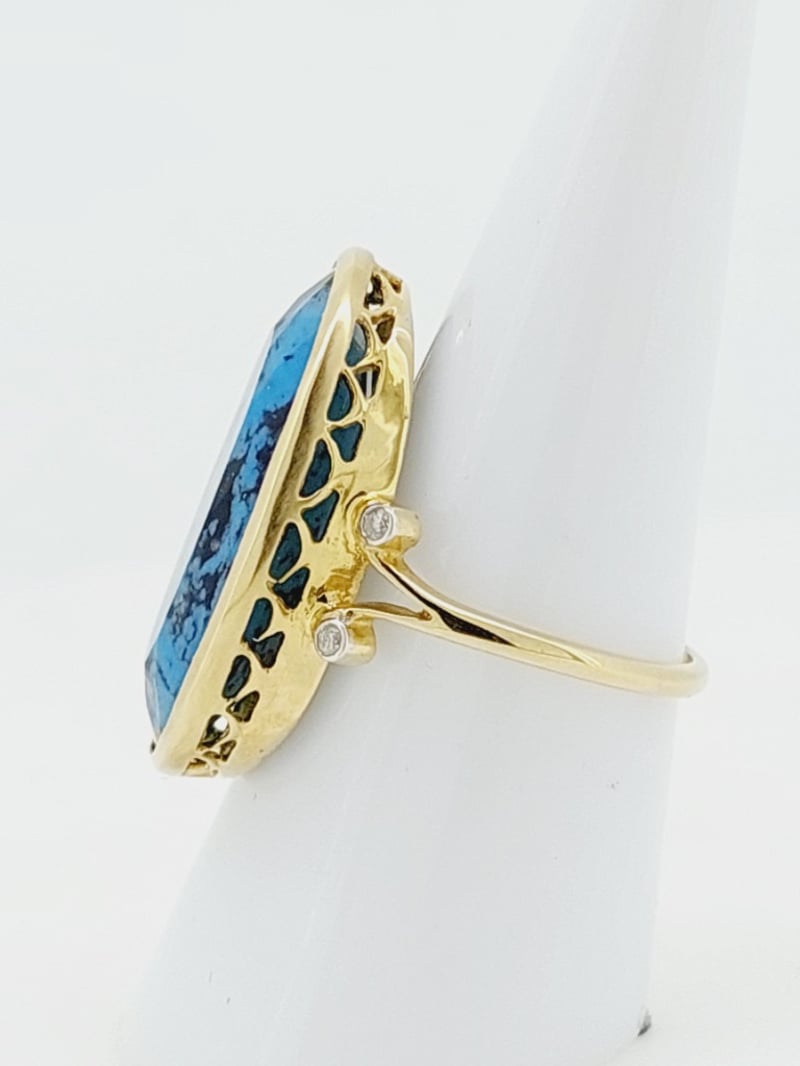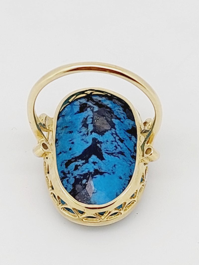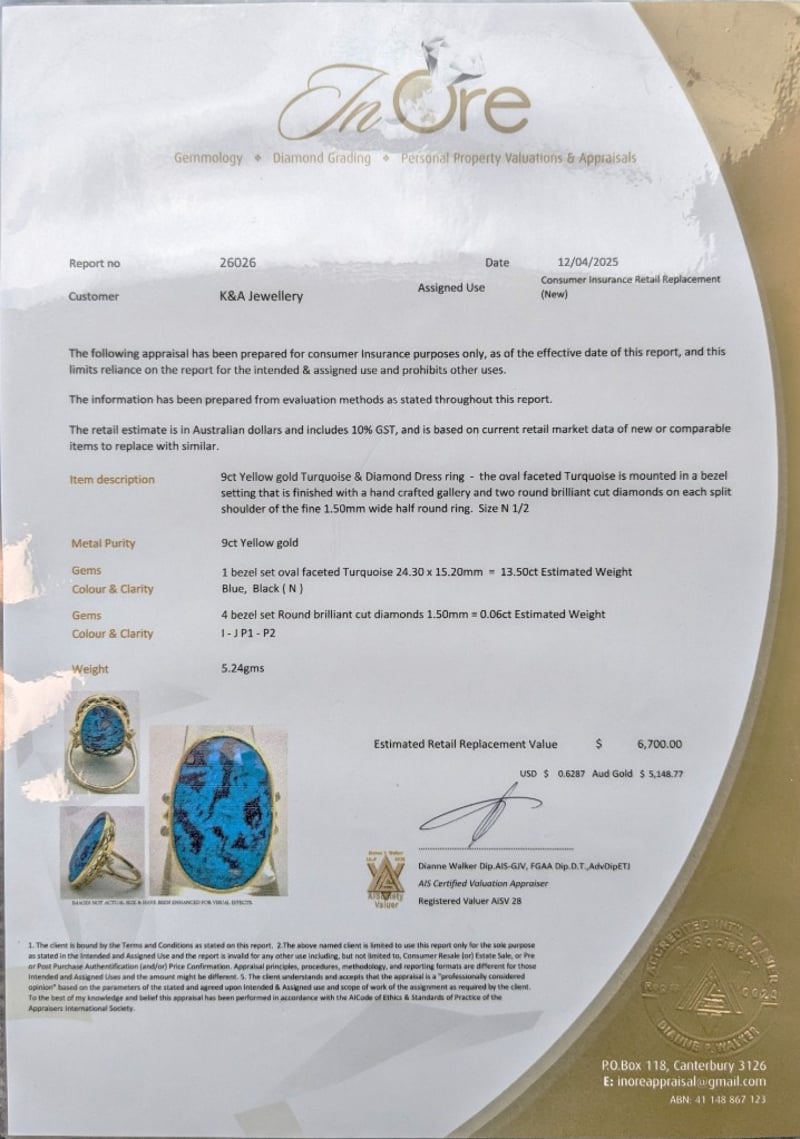 9CT YELLOW GOLD TURQUOISE AND DIAMOND DRESS RING The Oval Faceted Turquoise Is Mounted In A Bezel Setting That Is Finished With A Hand Crafted Gallery And Two Round Brilliant Cut Diamonds On Each Split Shoulder Of The Fine 1.50Mm Wide Half Round Ring. Size N1/2 Total Item Weight: 5.24g Condition: Good - Refer To Images This valuation has been conducted by an independent third-party professional. The valuation amount is an assessment by the issuing valuer and does not reflect the auction value of the item. Any inquiries regarding the valuation should be directed to the issuing valuer (refer to contact details on the certificate), as Lloyds Auctions has no affiliation or influence over the valuation, the valuer, or the stated amount. Insurance Replacement Valuation Amount: $6,700.00 CROSSDOCK 162949+1