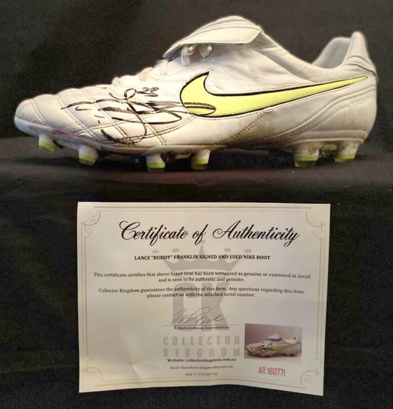 LANCE BUDDY FRANKLIN SIGNED AND MATCH WORN NIKE FOOTBALL BOOT - COA Lance Buddy Franklin Personally Signed And Match Worn Nike Football Boot - Possibly The Last Of The 1000 Goal Full Forwards Lance Buddy Franklin Signed Size 13 Match Used Football Boot. - 4Xcoleman Medalist 8Xall Australian 2X Premiership Player, Over 1000 Goals. - The Item Comes With Several Certifications Of Authenticity That Are Traceable With Photo Proof And Serial Numbers. - The Item Includes Several Certificates Of Authenticity And Communication From Three Different Memorabilia Businesses That Can Reiterate That The Item Is Genuinely Personally Signed And Used With Some Communication Being Able To Trace The Items Back To Around The Afl 2010 Season. 2010 - 64 Goals , All Australian , Goal Of The Year. Avg 3.6 Gpg (League Leader) Comes Used With Original Game Used Decomposed Turf And Dirt. CROSS DOCK 155544+15