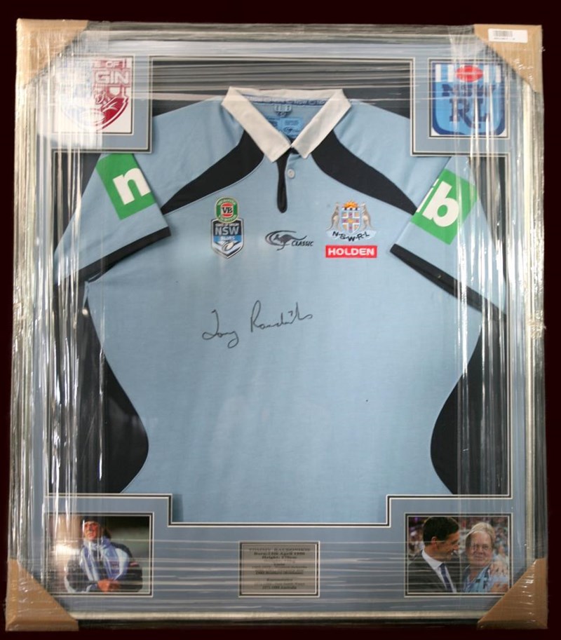 NSW'S FIRST STATE OF ORIGIN CAPTAIN TOMMY RAUDONIKIS SIGNED BLUES CLASSIC JERSEY - FRAMED - COA Tommy Raudonikis Personally Signed (And Inscribed 7) Nsw Blues Jersey The Jersey Is Custom Framed, Ready To Hang Measuring 860 X 760, This Was Signed At Tommy`S Final Official Signing On 18-1-21 The Item Is Accompanied By A Certificate Of Authenticity CROSS DOCK 155544+27