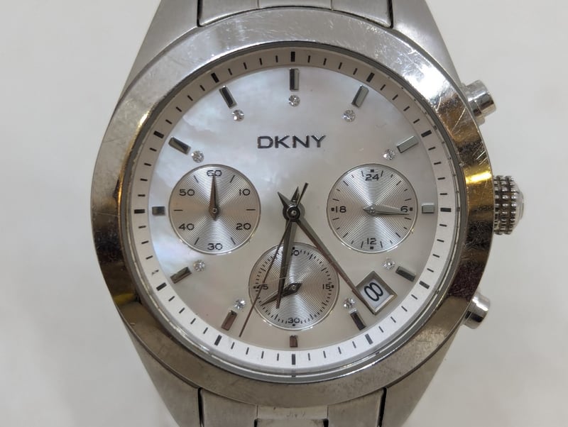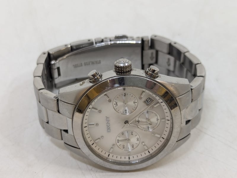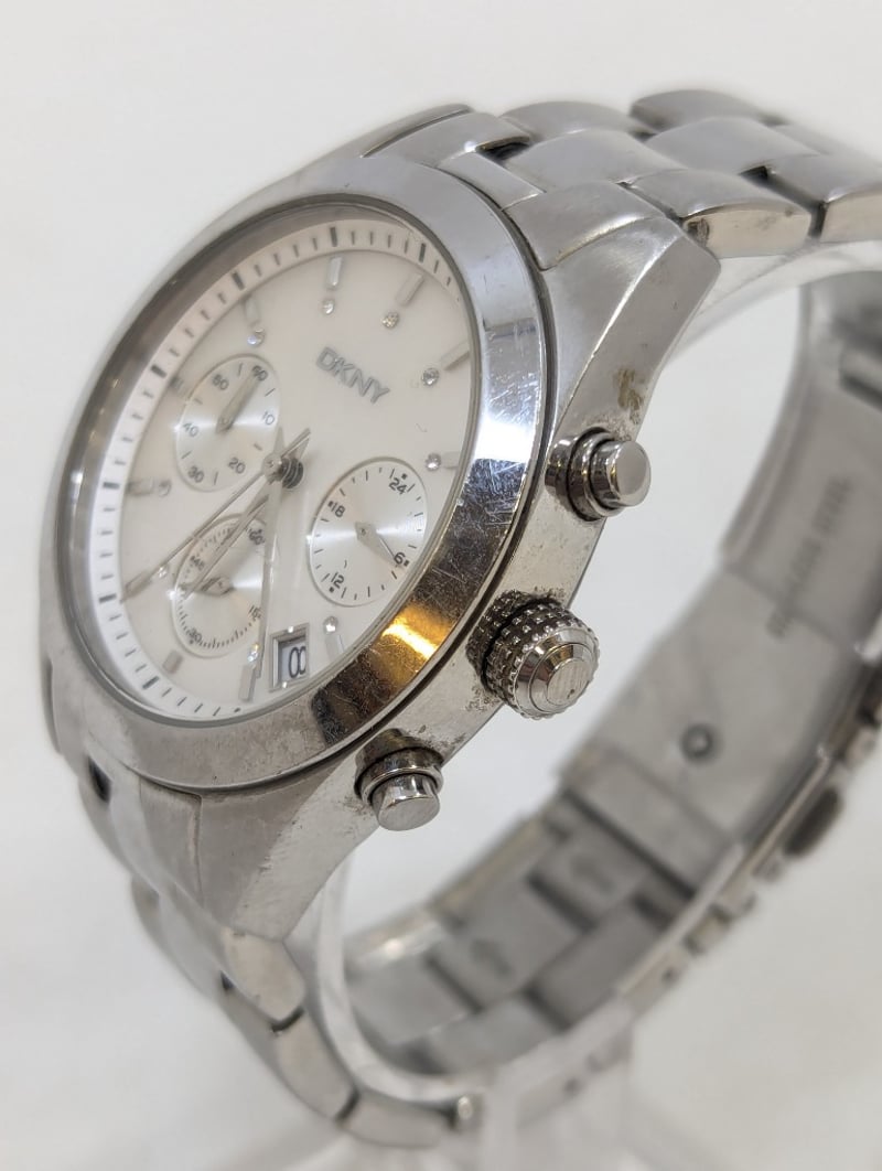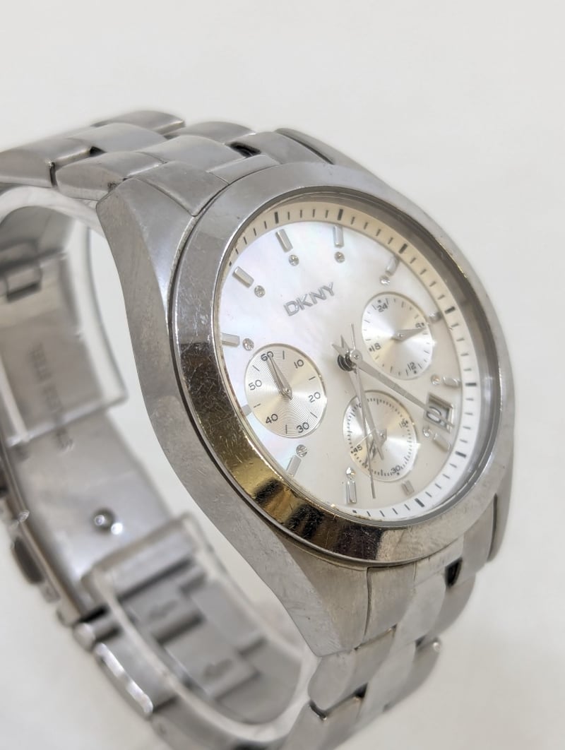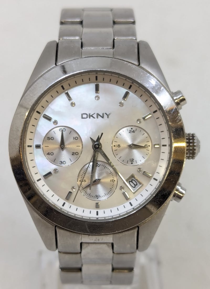 DKNY CASE DESCRIPTION: STAINLESS STEELCASE SIZE: 38MMBRACELET: STAINLESS STEELBOX: NOT INCLUDEDPAPERS: NOT INCLUDEDAdditional Information: Mother Of Pearl Style DialNon Numerical Hour MarkersRound Cut Clear Stones Set At Hour PositionsDate Display At 4:30 Position3X ChronographFold ClaspMovement Untested584253+5