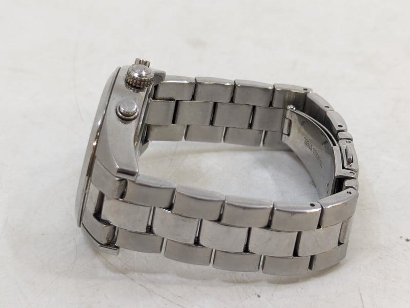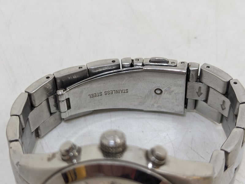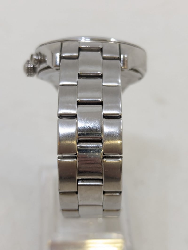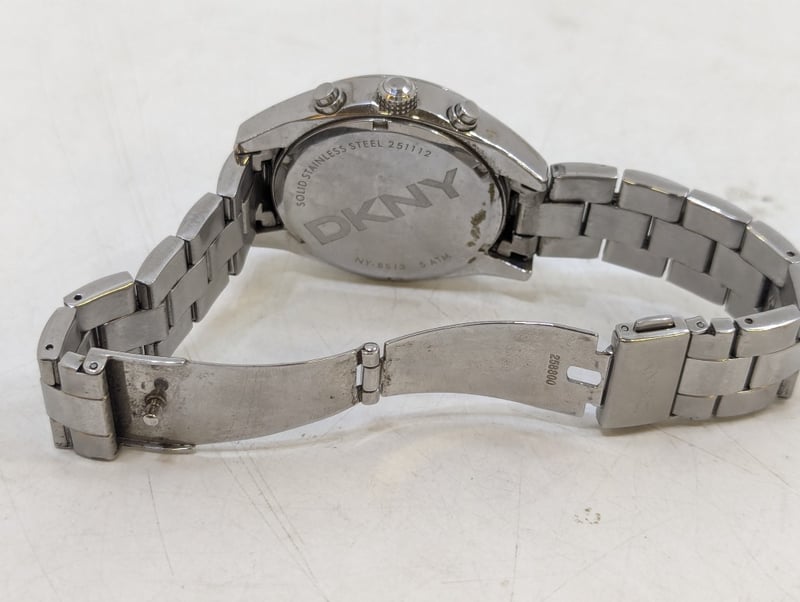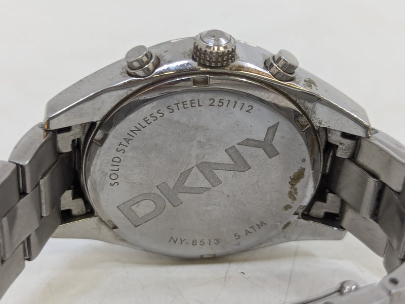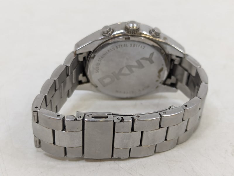 DKNY CASE DESCRIPTION: STAINLESS STEELCASE SIZE: 38MMBRACELET: STAINLESS STEELBOX: NOT INCLUDEDPAPERS: NOT INCLUDEDAdditional Information: Mother Of Pearl Style DialNon Numerical Hour MarkersRound Cut Clear Stones Set At Hour PositionsDate Display At 4:30 Position3X ChronographFold ClaspMovement Untested584253+5