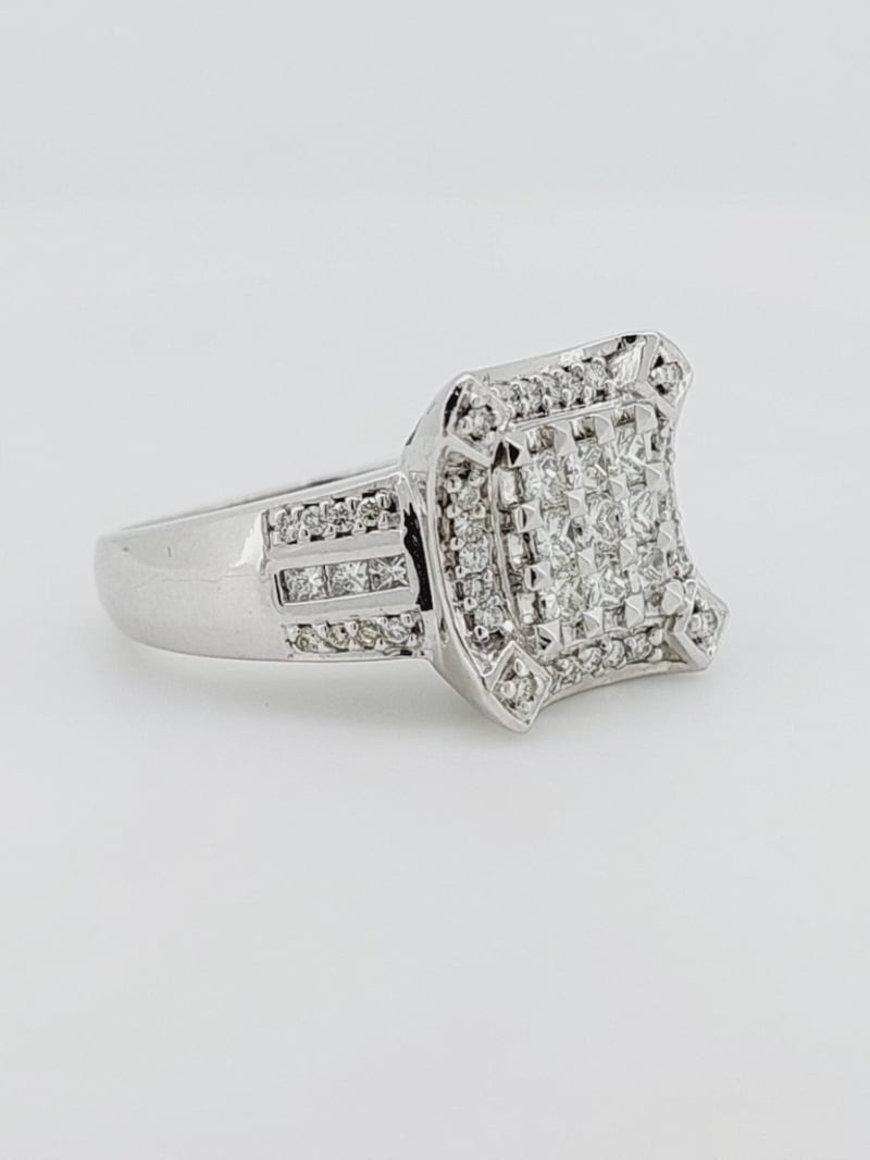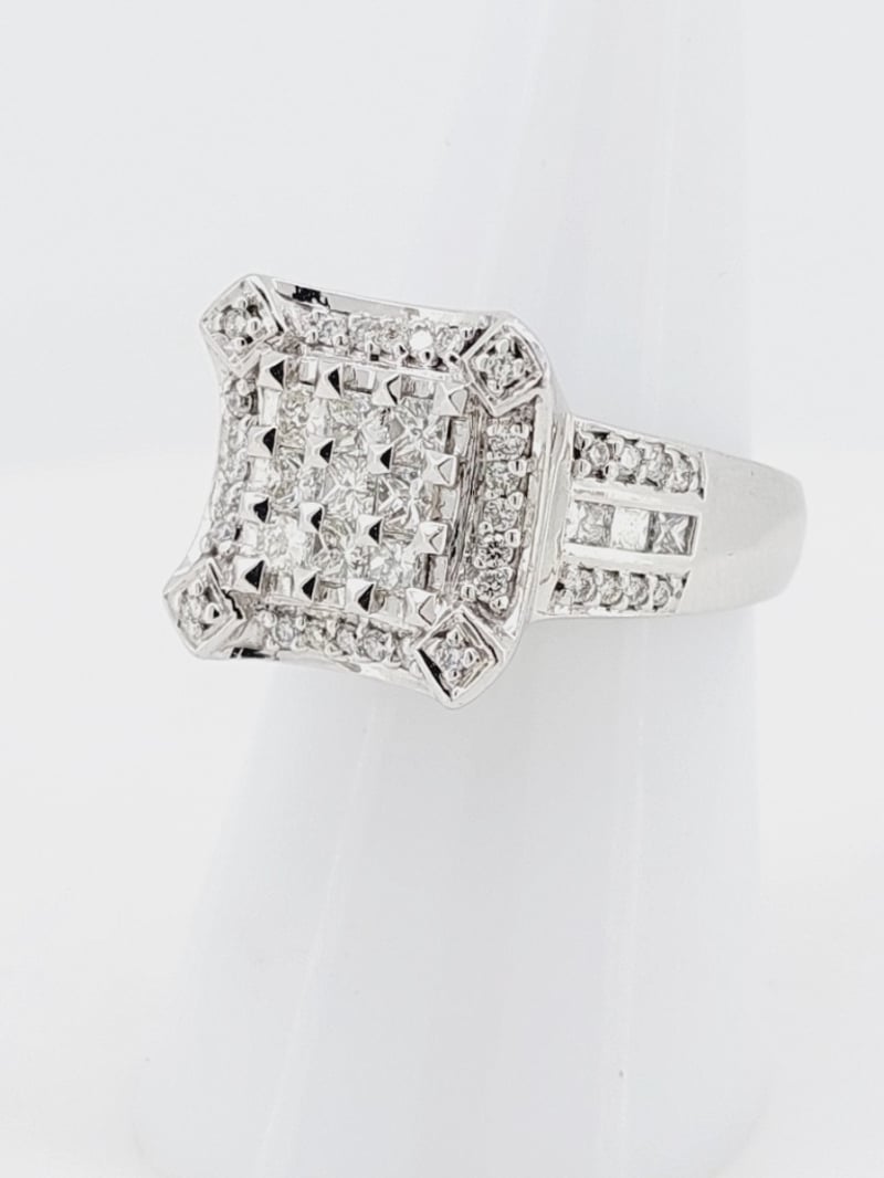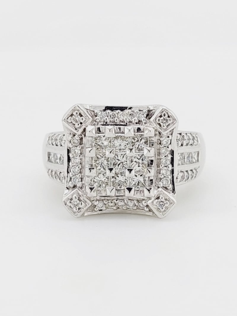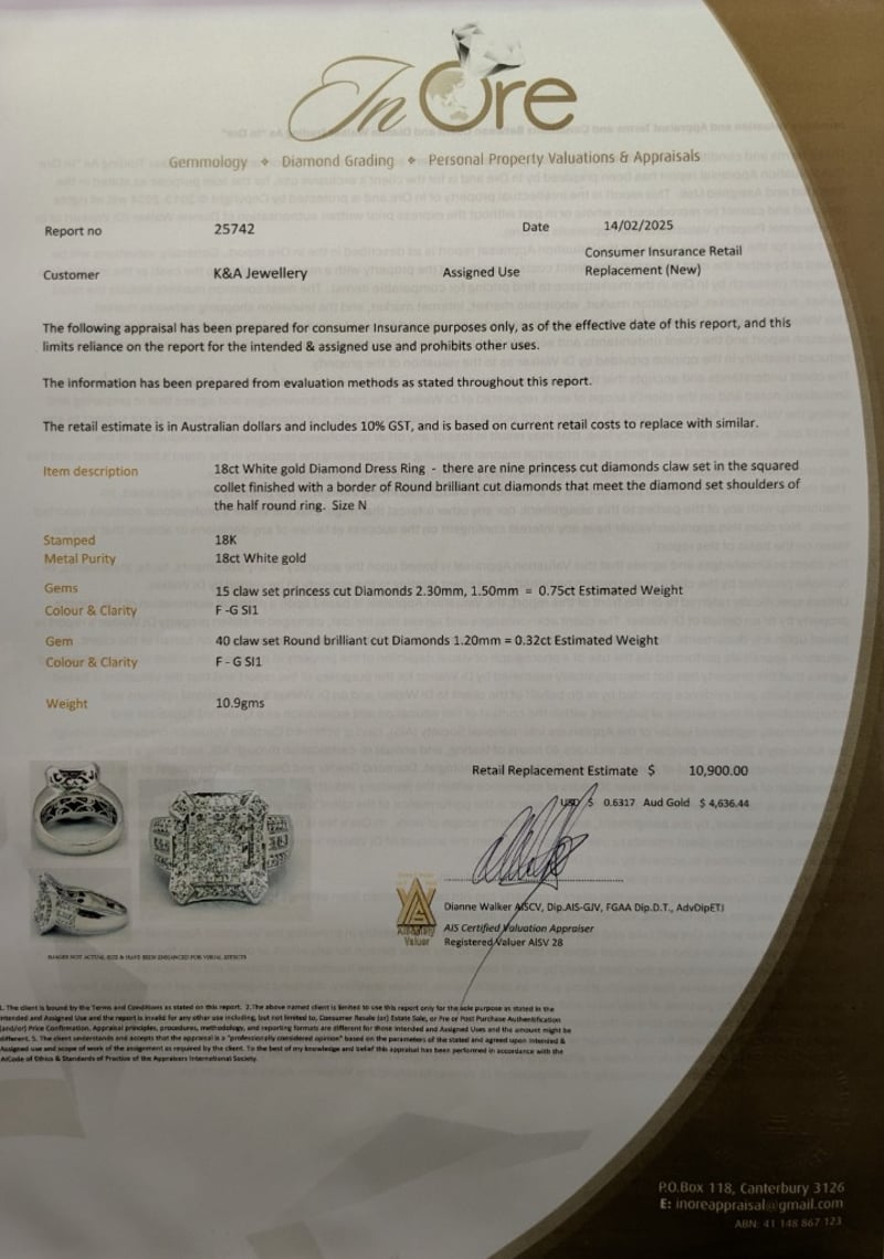 18K WHITE GOLD DIAMOND DRESS RING There Are Nine Princess Cut Diamonds, Claw Set In The Squared Collet Finished With A Border Of Round Brilliant Cut Diamonds That Meet The Diamond Set Shoulders Of The Half Round Ring. Size N Total Item Weight: 10.90g Markings: 18K Condition: Good - Refer To Images This valuation has been conducted by an independent third-party professional. The valuation amount is an assessment by the issuing valuer and does not reflect the auction value of the item. Any inquiries regarding the valuation should be directed to the issuing valuer (refer to contact details on the certificate), as Lloyds Auctions has no affiliation or influence over the valuation, the valuer, or the stated amount. Insurance Replacement Valuation Amount: $10,900.00 CROSSDOCK 162949+8