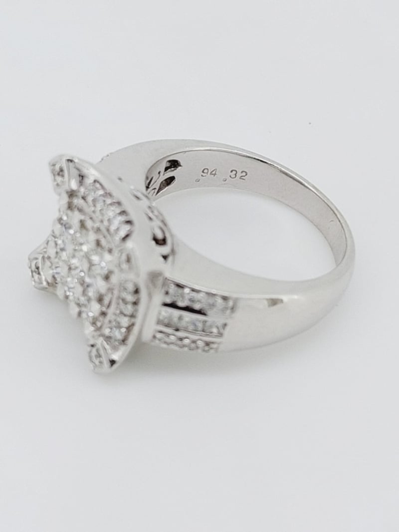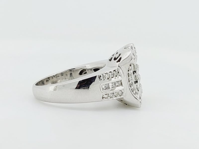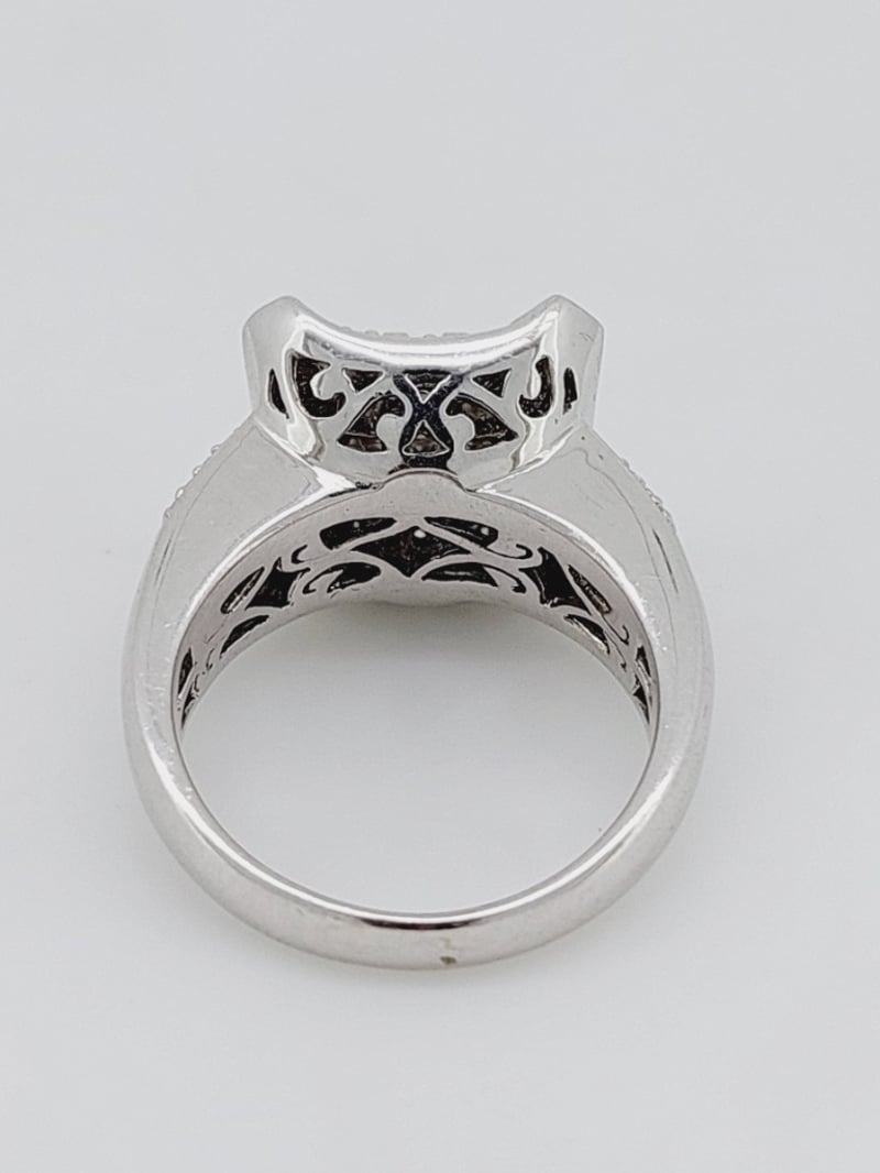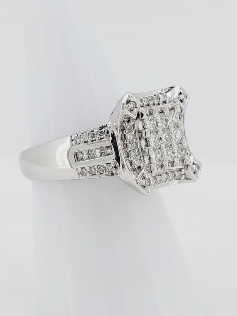 18K WHITE GOLD DIAMOND DRESS RING There Are Nine Princess Cut Diamonds, Claw Set In The Squared Collet Finished With A Border Of Round Brilliant Cut Diamonds That Meet The Diamond Set Shoulders Of The Half Round Ring. Size N Total Item Weight: 10.90g Markings: 18K Condition: Good - Refer To Images This valuation has been conducted by an independent third-party professional. The valuation amount is an assessment by the issuing valuer and does not reflect the auction value of the item. Any inquiries regarding the valuation should be directed to the issuing valuer (refer to contact details on the certificate), as Lloyds Auctions has no affiliation or influence over the valuation, the valuer, or the stated amount. Insurance Replacement Valuation Amount: $10,900.00 CROSSDOCK 162949+8