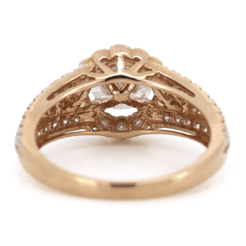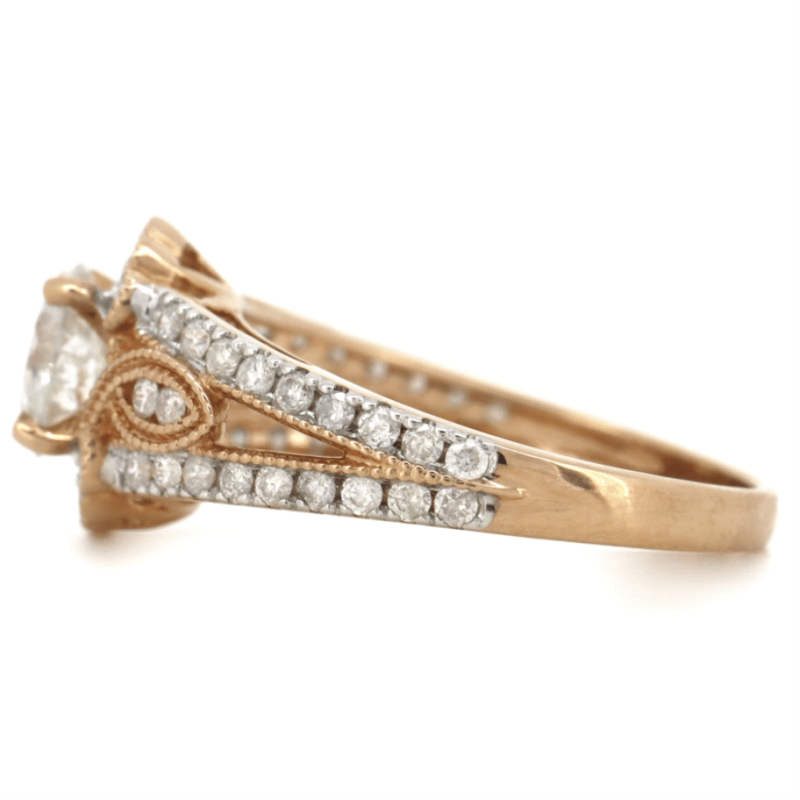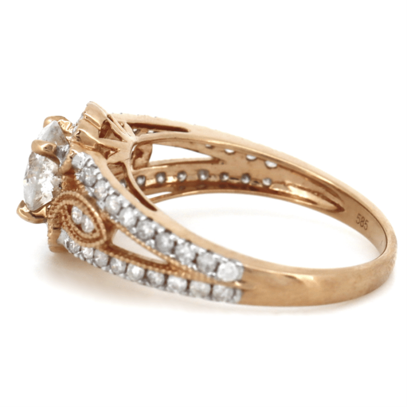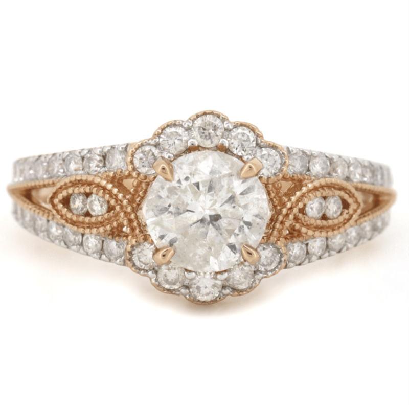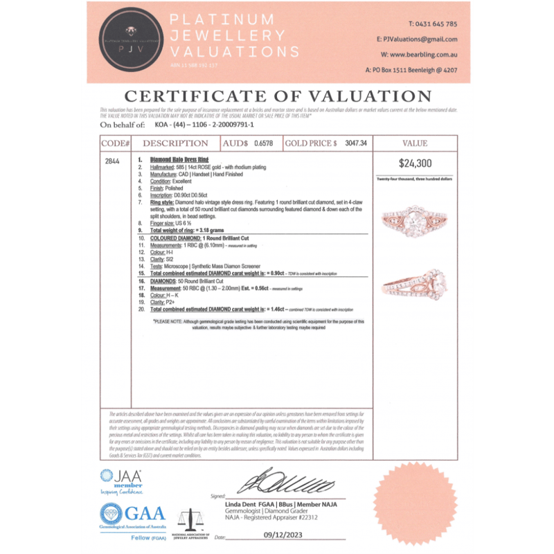 14K ROSE GOLD AND DIAMOND, HALO FILIGREE RING. The Centre Features, One Round Brilliant Cut, Diamond (0.90Ct, H-I Colour, Si2 Clarity), 4 Claw Set. Decorating The Setting Are, 50 Round Brilliant Cut, Diamonds (0.56Ct Tdw, H-K Colour, P2+ Clarity), Claw Set. Ring Size M. Valuations Provided by an Independent Third-Party Professional Not Directly Associated With Lloyds Auctions at AUD $$24,300.00This valuation has been conducted by an independent third-party professional. The valuation amount is an assessment by the issuing valuer and does not reflect the auction value of the item. Any inquiries regarding the valuation should be directed to the issuing valuer (refer to contact details on the certificate), as Lloyds Auctions has no affiliation or influence over the valuation, the valuer, or the stated amount. Condition: Good - Refer Images 0645844+5022