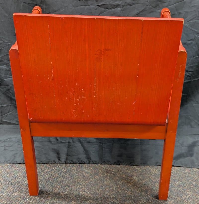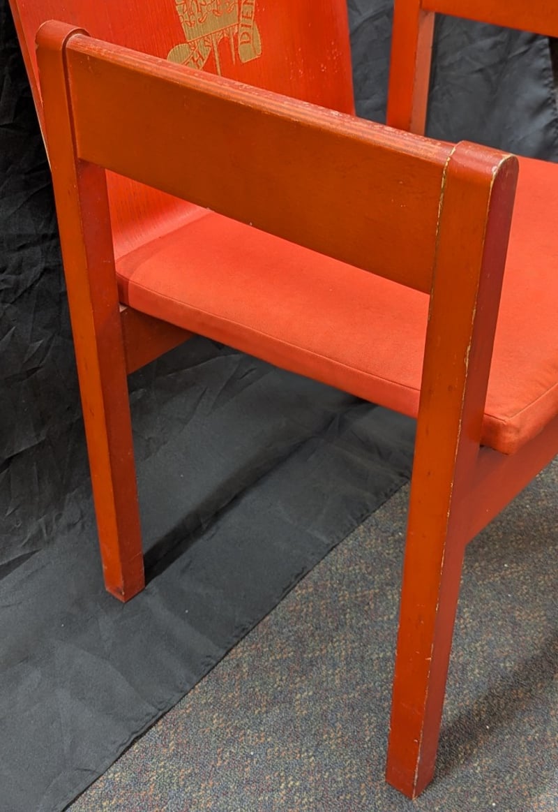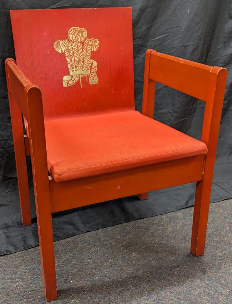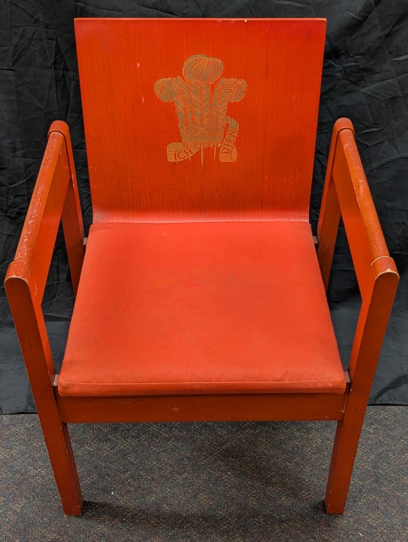 RED-PAINTED ASH-LAMINATE PRINCE OF WALES INVESTITURE CHAIRItem Size: Height: 78cm, Width: 55cm, Depth: 53cmTimber Construction, Red Colour, Cushioned SeatIncludes 1969 Supporting Documentation And News ArticleCondition: Good - Refer To Images584912+4