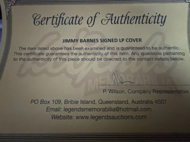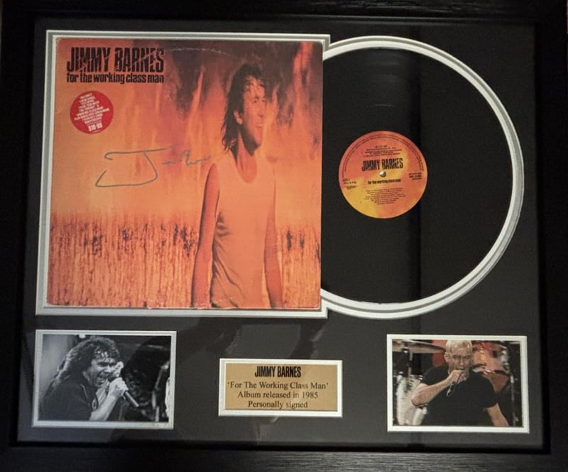 JIMMY BARNES 'WORKING CLASS MAN; SIGNED/FRAMED LP Jimmy Barnes Personally Signed 'For The Working Class Man' Lp. The Album Has Been Custom Framed With Concert Photos And Gold Plaque. Measuring X , This Is Ready To Hang. The Item Is Accompanied By A Certificate Of Authenticity. +9