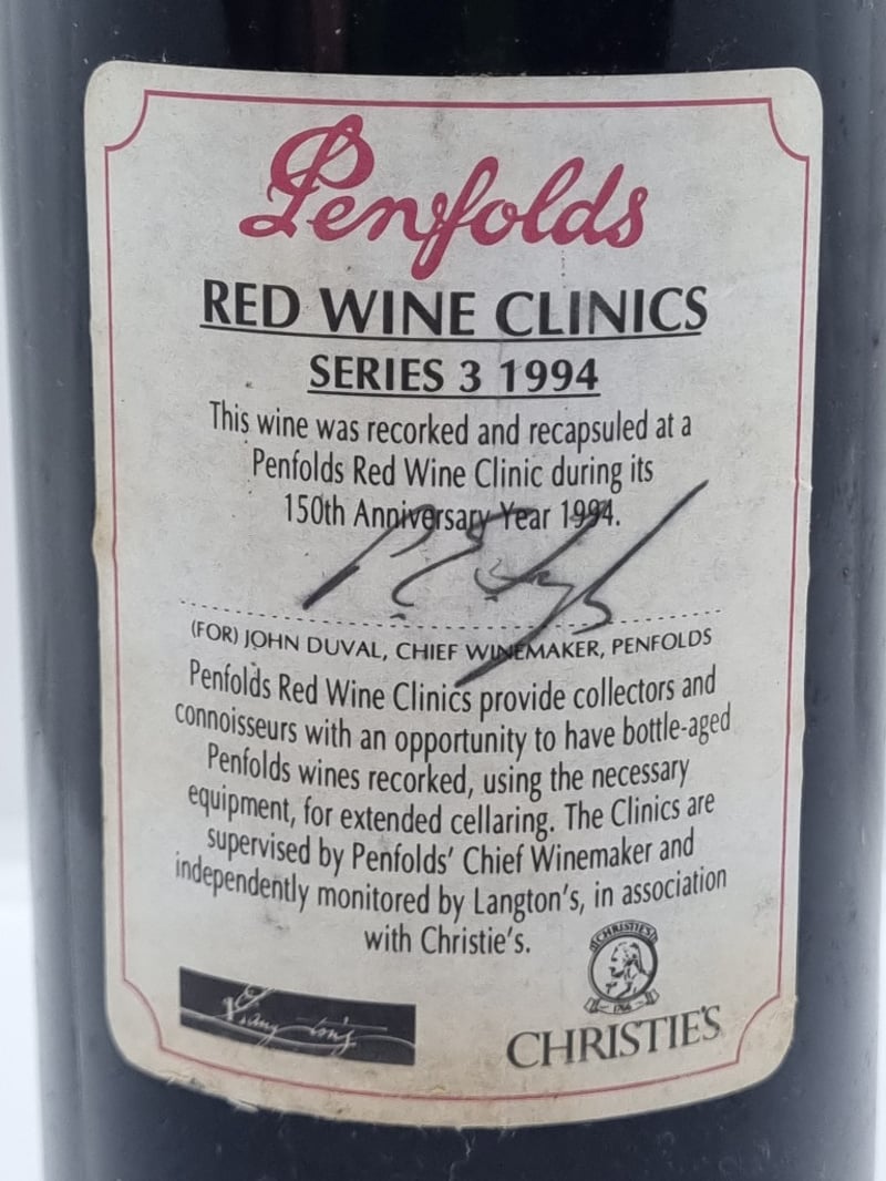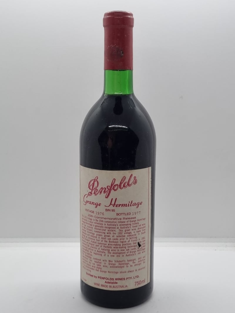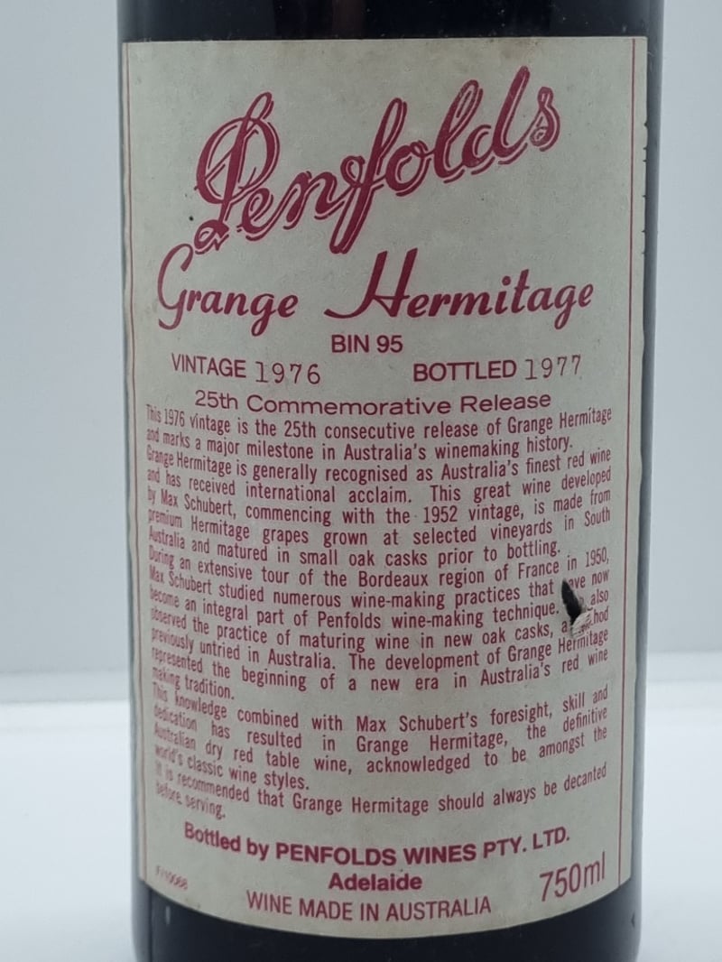 PENFOLDS GRANGE HERMITAGE BIN 95 , VINTAGE 1976, Bottled 1977 750mL, Series 3 Clinic 1994, COLOUR Youthful purple/red. NOSE Intense and concentrated liquorice/chocolate/ berry/truffle aromas with touches of earthiness. PALATE Powerful with rich plum/chocolate/berry/ liquorice fruit flavours, thick velvety tannin structure and excellent length. Should be a very long-lived wine.