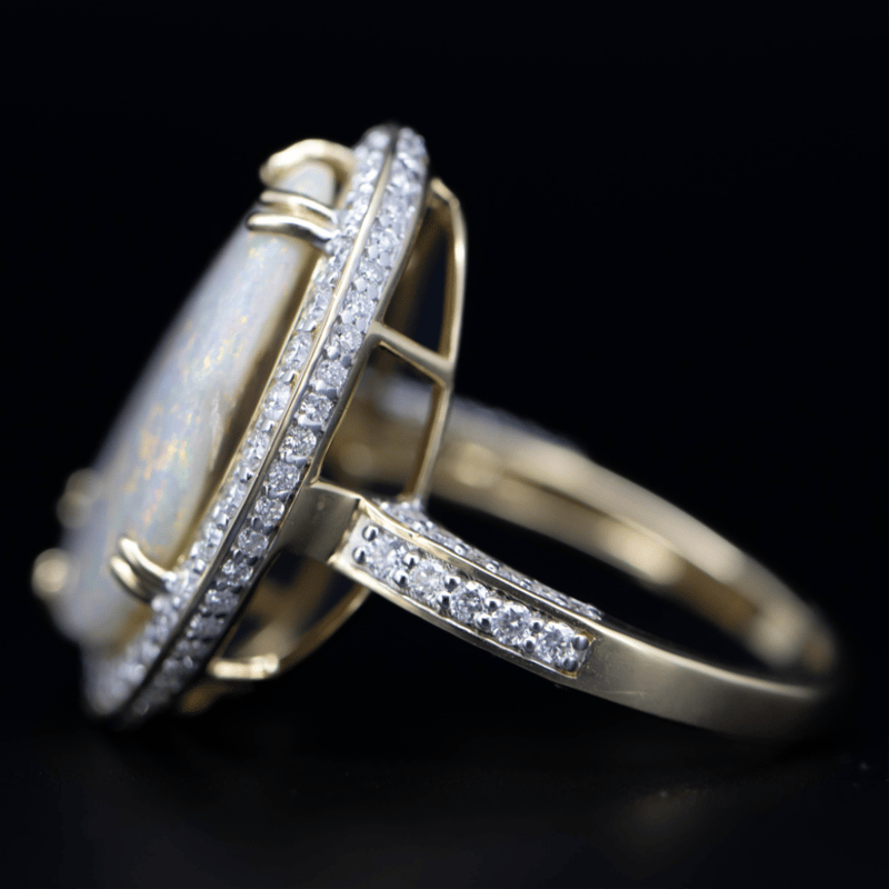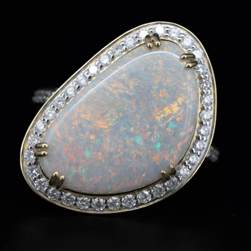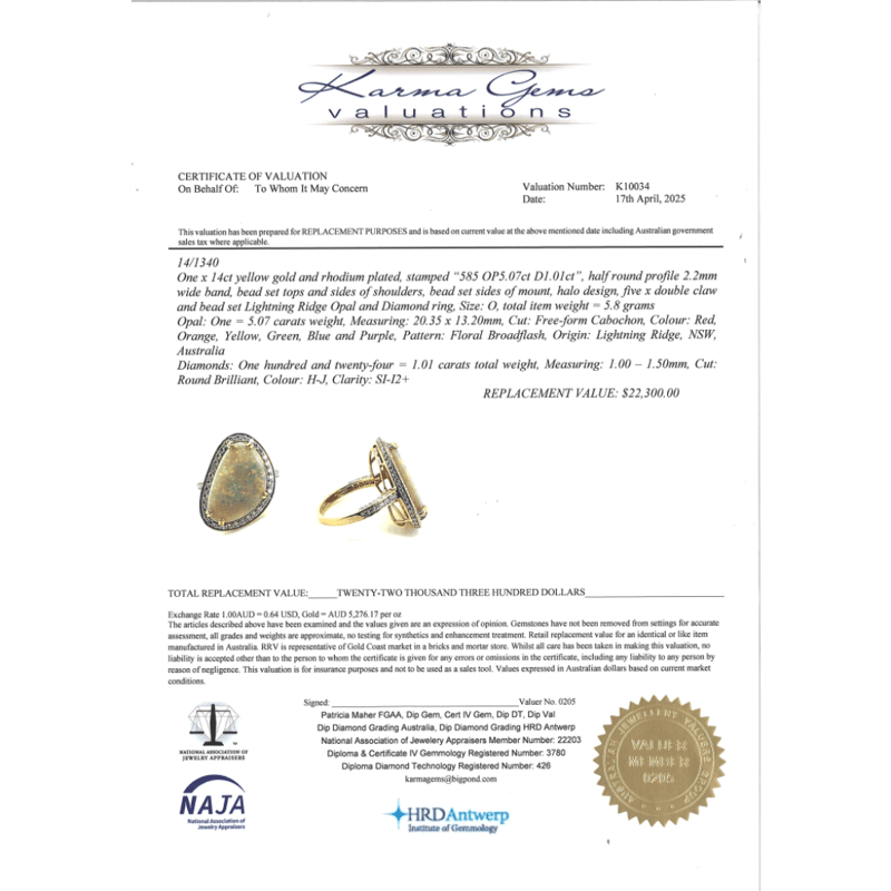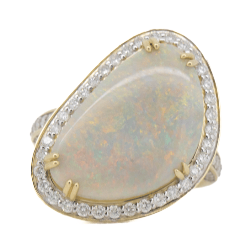 The Centre Features, Free-Form Cabochon Cut, Lightning Ridge Opal (5.07Ct, Red, Orange, Yellow, Green, Blue And Purple Colour Play, Floral Broadflash Pattern), Claw Set. Surrounding The Centre In A Halo And Decorating Shoulders Are 124 Round Brilliant Cut Diamonds (1.01Ct Tdw, H-J Colour, Si1-I2+Clarity), Bead Set. Ring Size: O.
