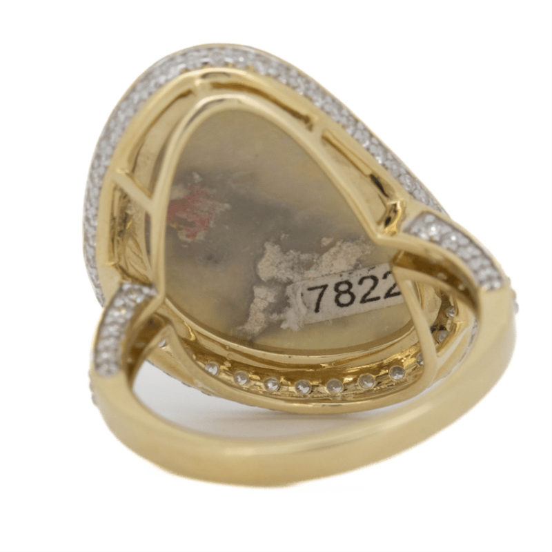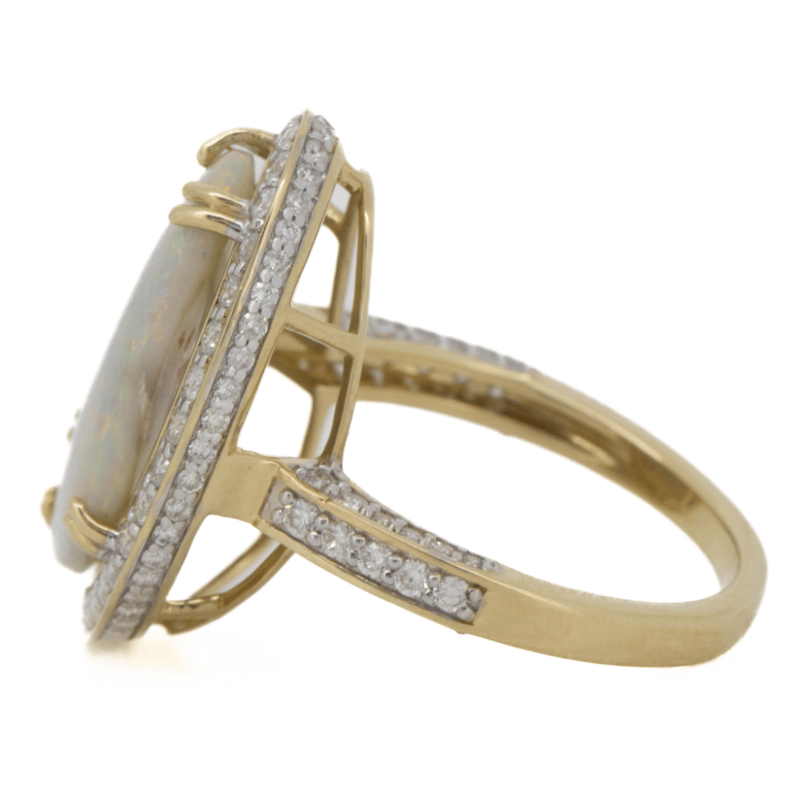 14K YELLOW GOLD, 5.07CT LIGHTNING RIDGE OPAL AND DIAMOND, HALO RING.