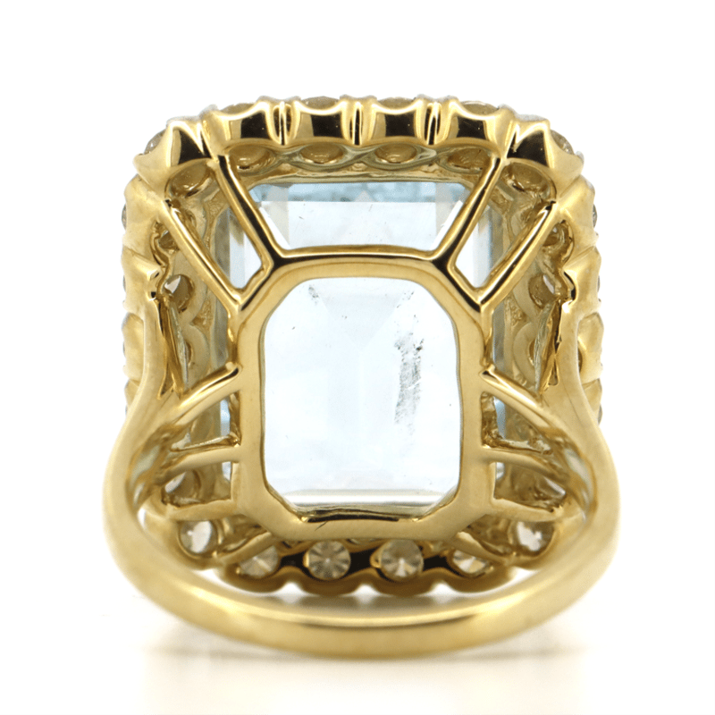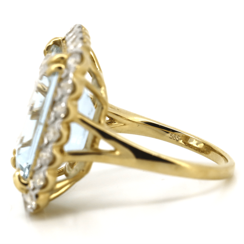 14K YELLOW GOLD, AQUAMARINE AND DIAMOND, HALO RING. The Centre Features, One Emerald Mixed Cut, Light Blue, Aquamarine (11.31Ct, Slightly Included), Double 4 Claw Set. Encompassing The Centre In A Halo Are, 22 Round Brilliant, Cut, Diamonds (J-K Colour, Si2-I2 Clarity), Semi-Bezel Set. Ring Size O. Valuations Provided by an Independent Third-Party Professional Not Directly Associated With Lloyds Auctions at AUD $$26,000.00This valuation has been conducted by an independent third-party professional. The valuation amount is an assessment by the issuing valuer and does not reflect the auction value of the item. Any inquiries regarding the valuation should be directed to the issuing valuer (refer to contact details on the certificate), as Lloyds Auctions has no affiliation or influence over the valuation, the valuer, or the stated amount. Condition: Good - Refer Images 0645844+5011