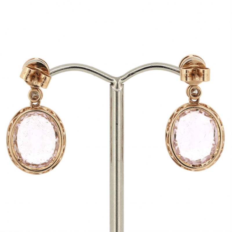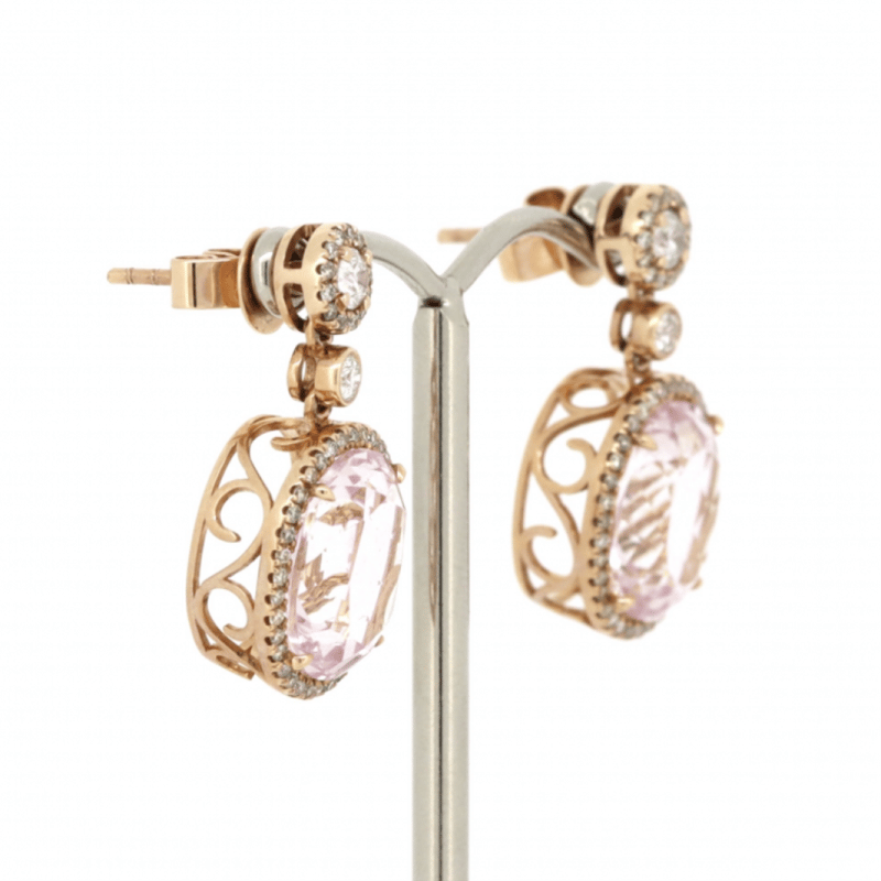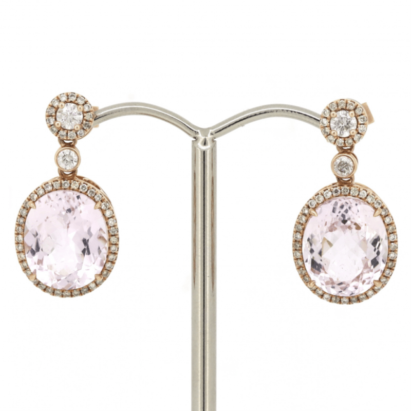 The Drops Feature, 2 Oval Cut, Light Pinkish-Purple, Kunzites (10.70Ct Tsw, Eye Clean Clarity), Claw Set. Surrounding The Drops And Studs In Halos Are, 98 Round Brilliant Cut, Diamonds (0.40Ct Tdw, J-K Colour, Si2-I2 Clarity), Micro-Claw Set. Surmounting The Drops And Centring The Studs Are, 4 Round Brilliant Cut, Diamonds (0.34Ct Tdw, J-K Colour, Si2-I2 Clarity), Bezel/Claw Set. The Earrings Have Post Backs, With 14K Rose Gold Butterfly Clasps.