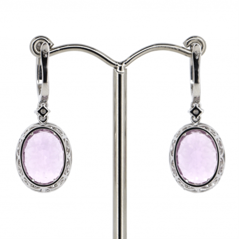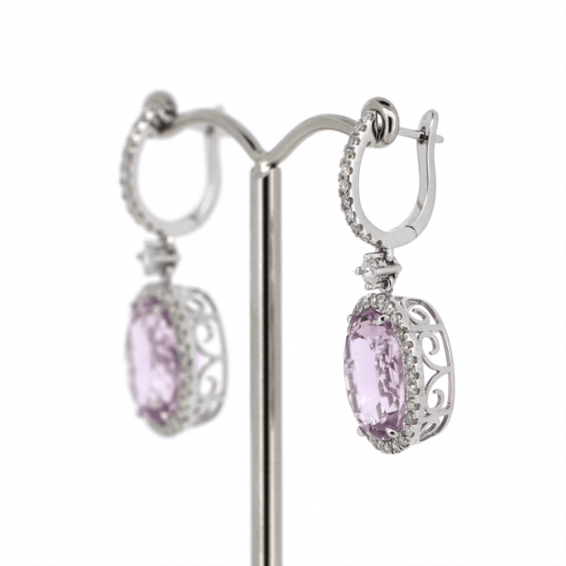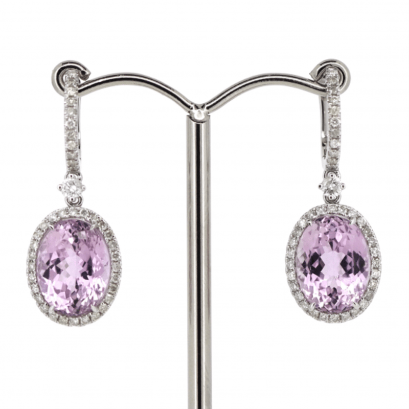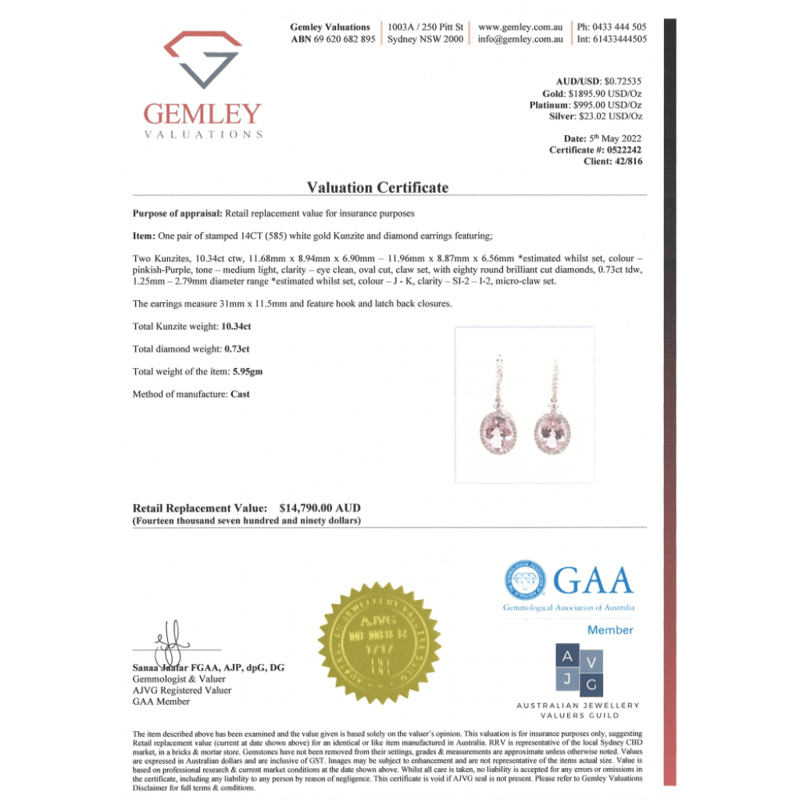 14K WHITE GOLD, KUNZITE AND DIAMOND, HALO DROP EARRINGS. The Centres Feature, 2 Oval Cut, Pinkish-Purple, Kunzites (10.34Ct Tsw, Eye Clean Clarity), 4 Claw Set. Surrounding The Centres In Halos And Decorating The Hooks Are, 80 Round Brilliant Cut, Diamonds (0.73Ct Tdw, J-K Colour, Si2-I2 Clarity), Claw Set. The Earrings Have Latch Backs. Valuations Provided by an Independent Third-Party Professional Not Directly Associated With Lloyds Auctions at AUD $$14,790.00This valuation has been conducted by an independent third-party professional. The valuation amount is an assessment by the issuing valuer and does not reflect the auction value of the item. Any inquiries regarding the valuation should be directed to the issuing valuer (refer to contact details on the certificate), as Lloyds Auctions has no affiliation or influence over the valuation, the valuer, or the stated amount. Condition: Good - Refer Images 0645845+1515