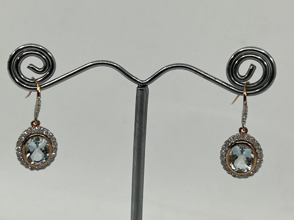 14CT ROSE GOLD AQUAMARINE AND DIAMOND EARINGS Two Aquamarines, 2.21Ct Ctw 8.64Mm X 6.69Mm X 3.81Mm 8.38Mm X 6.47Mm X 4.10Mm *Estimated Whilst Set, Colour Greyish-Blue, Tone - Light, Clarity Eye Clean, Oval Cut, Bezel Set, With Fifty-Eight Round Brilliant Cut Diamonds, 0.55Ct Tdw 0.83Mm 1.38Mm Diameter Range Estimated Whilst Set, Colour - H-I, Clarity - Si-2-1-1, Claw Set In White Gold. Total Item Weight: 3.11g Markings: 585 Condition: Good - Refer To Images This valuation has been conducted by an independent third-party professional. The valuation amount is an assessment by the issuing valuer and does not reflect the auction value of the item. Any inquiries regarding the valuation should be directed to the issuing valuer (refer to contact details on the certificate), as Lloyds Auctions has no affiliation or influence over the valuation, the valuer, or the stated amount. Insurance Replacement Valuation Amount: $8,460.00 586033+2