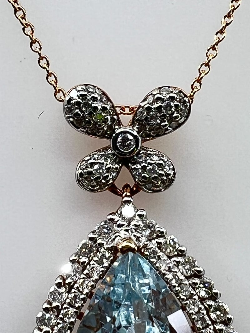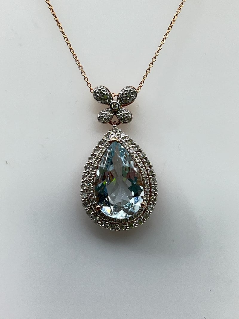 14CT ROSE GOLD AQUAMARINE AND DIAMOND PEDANT One 4.66Ct Aquamarine, 15.85Mm X 9.95Mm X 5.70Mm *Estimated Whilst Set, Colour - Greyish-Blue, Tone - Light, Clarity - Eye Clean, Pear Cut, Three Claw Set, With Ninety-Seven Round Brilliant Cut Diamonds, 0.63Ct Tdw, 1.36Mm - 1.84Mm Diameter Range *Estimated Whilst Set, Colour - G - H, Clarity - Si-2- I-2, Bead Set. Total Item Weight: 3.50g Markings: 585 Condition: Good - Refer To Images This valuation has been conducted by an independent third-party professional. The valuation amount is an assessment by the issuing valuer and does not reflect the auction value of the item. Any inquiries regarding the valuation should be directed to the issuing valuer (refer to contact details on the certificate), as Lloyds Auctions has no affiliation or influence over the valuation, the valuer, or the stated amount. Insurance Replacement Valuation Amount: $12,290.00 586033+6