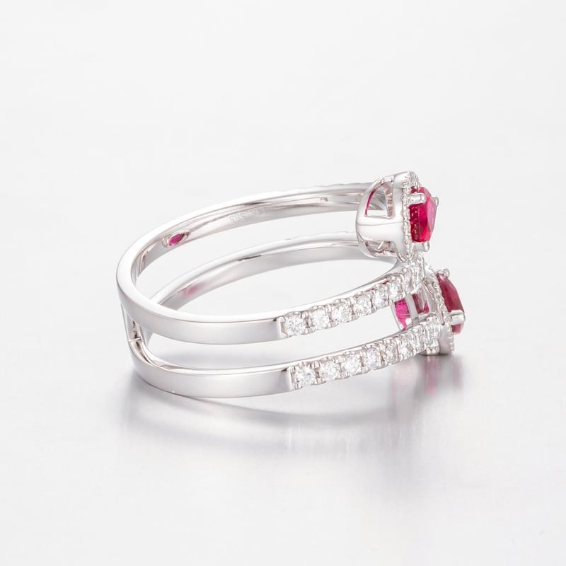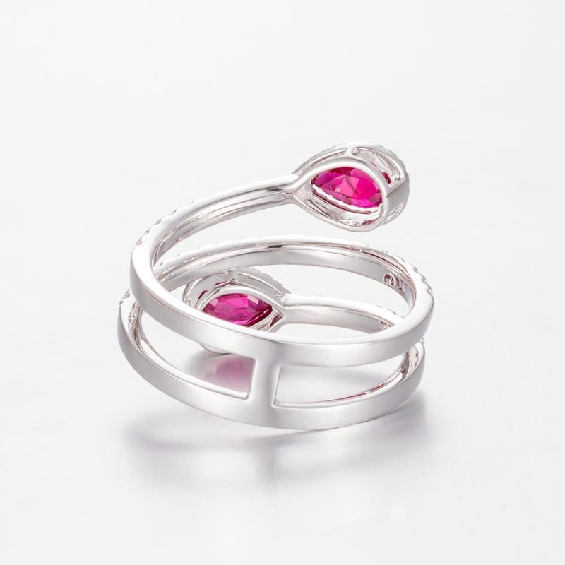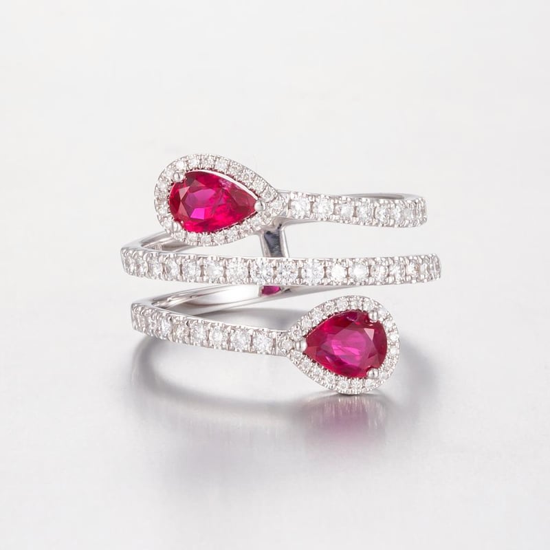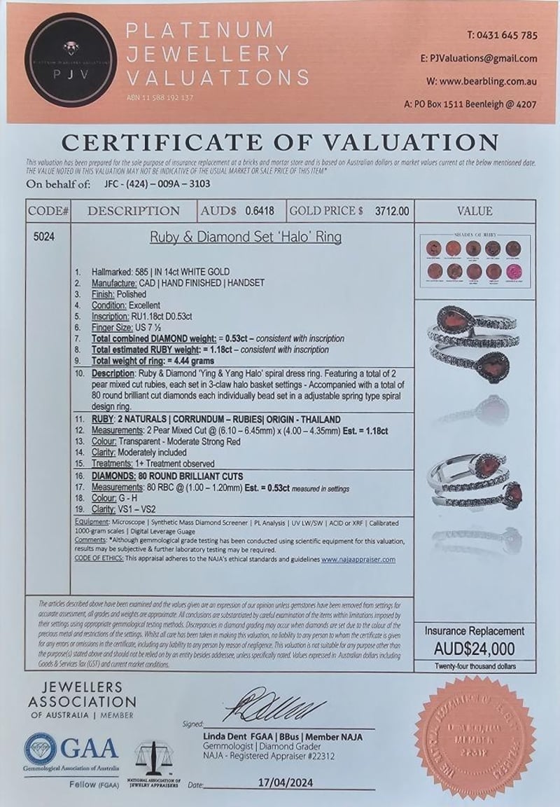 14CT WHITE GOLD RUBY AND DIAMOND SPIRAL RING FEATURING CENTRE, 2 PEAR CUT, MODERATE STRONG RED RUBIES (1.18CT TSW, MODERATELY INCLUDED), CLAW SET, WITH 80 ROUND BRILLIANT CUT DIAMONDS (0.53CT TDW, G-H COLOUR, VS1-VS2 CLARITY), BEAD SET. RING SIZE O. Valuations Provided by an Independent Third-Party Professional Not Directly Associated With Lloyds Auctions at AUD $24000This valuation has been conducted by an independent third-party professional. The valuation amount is an assessment by the issuing valuer and does not reflect the auction value of the item. Any inquiries regarding the valuation should be directed to the issuing valuer (refer to contact details on the certificate), as Lloyds Auctions has no affiliation or influence over the valuation, the valuer, or the stated amount. Condition: Good - Refer Images 0+467