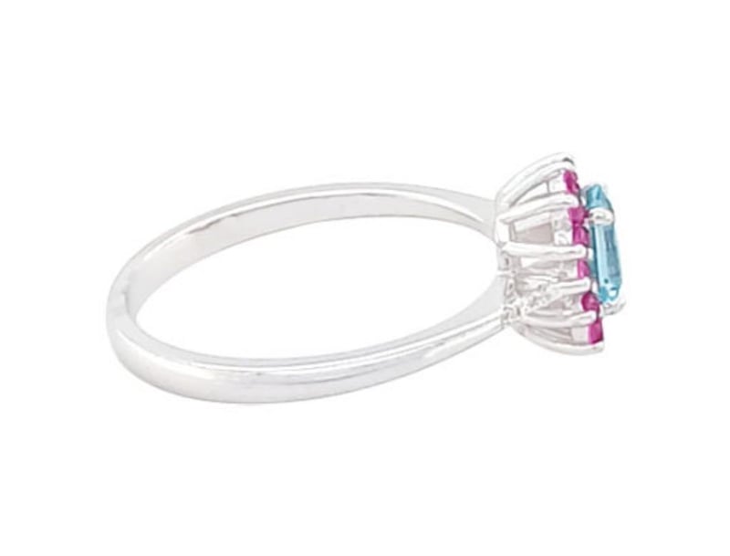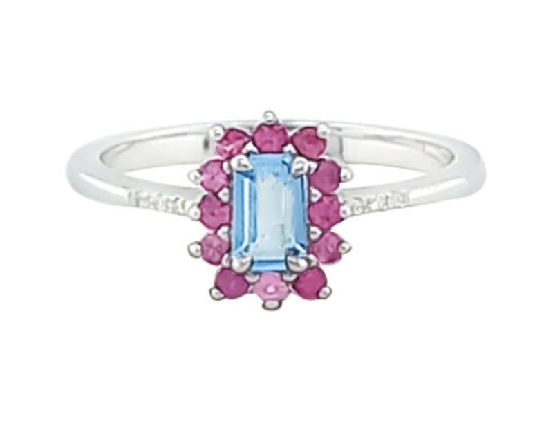 9CT WHITE GOLD AQUAMARINE SAPPHIRE AND DIAMODN RING