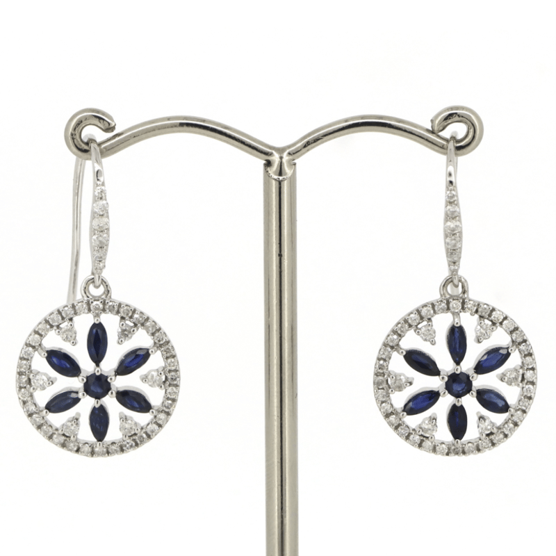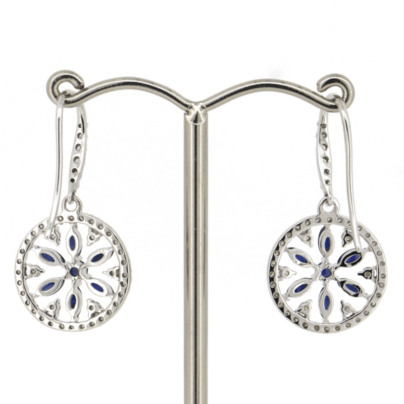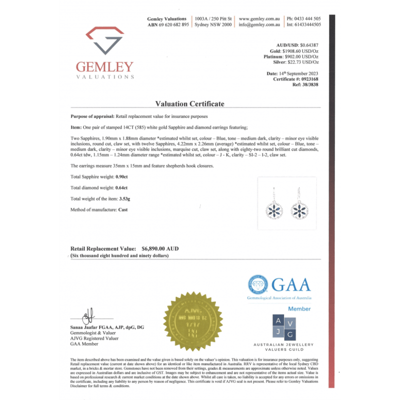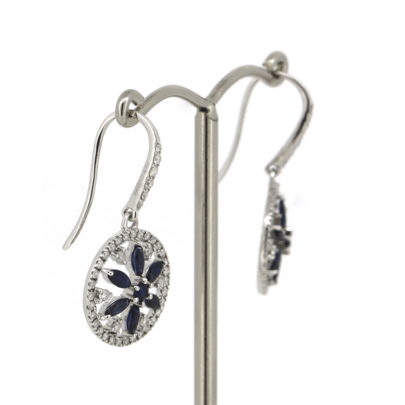 14K WHITE GOLD, BLUE SAPPHIRE AND DIAMOND, DECORATIVE DROP EARRINGS. The Centres Feature, 2 Round Brilliant Cut And 12 Marquise Cut, Medium Dark Blue, Sapphires (0.90Ct Tsw, Minor Eye Visible Inclusions), Claw Set. Decorating The Centres Are, 82 Round Brilliant Cut, Diamonds (0.64Ct Tdw, J-K Colour, Si2-I2 Clarity), Claw Set. The Earrings Feature Shepherds Hook Closures. Valuations Provided by an Independent Third-Party Professional Not Directly Associated With Lloyds Auctions at AUD $$6,890.00This valuation has been conducted by an independent third-party professional. The valuation amount is an assessment by the issuing valuer and does not reflect the auction value of the item. Any inquiries regarding the valuation should be directed to the issuing valuer (refer to contact details on the certificate), as Lloyds Auctions has no affiliation or influence over the valuation, the valuer, or the stated amount. Condition: Good - Refer Images 0645845+1586