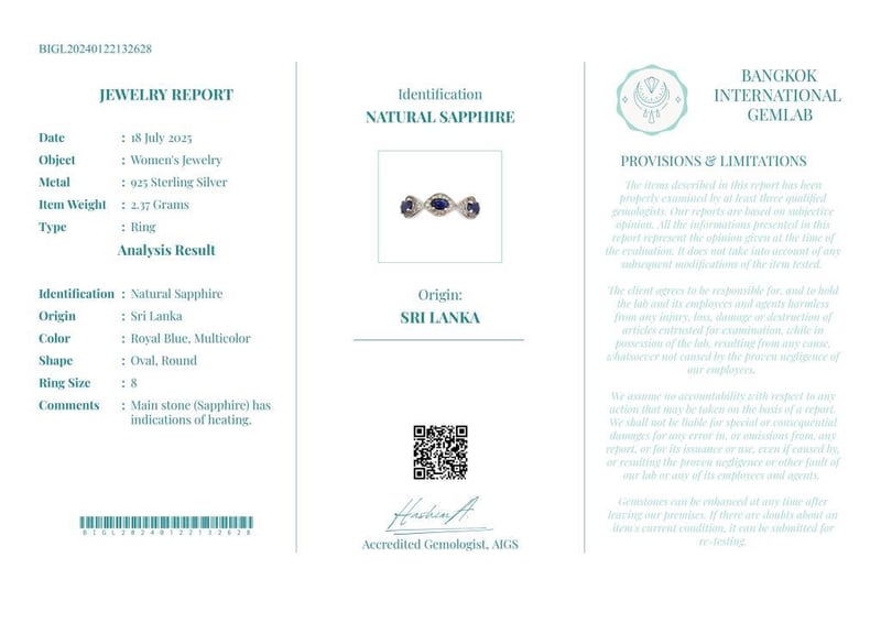 NATURAL SRI LANKAN SAPPHIRE RING ON 925 SILVER - WITH DIGITAL CERTIFICATE ONLY Gemstone : Natural Sri Lankan SapphireCertificate (Digital): Bigl20240122132628Item Total Weight : 2.37 GramsMain Stone Color : Royal Blue, MulticolorSize : 8Comments : Main Stone (Sapphire) Has Indications Of Heating.✻ Verify Report Online At Www.Bangkokinternationalgemlab.Co Condition: Good - Refer Images 01611139+11