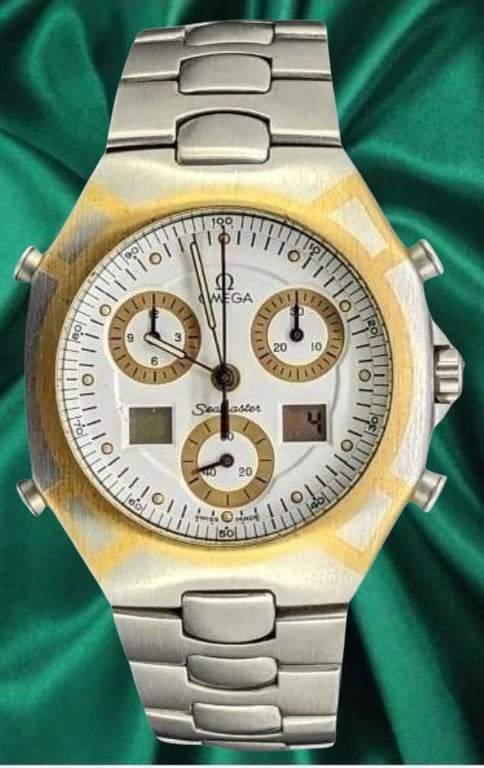 OMEGA TITANE SEAMASTER POLARIS CHRONO 386.1231 1980's Price Guide - Circa $3,000 REFERENCE NO. 386.1231 PRODUCTION YEAR: 1980's DIAL: WHITE WITH GOLD RING CASE DESCRIPTION: TITANIUM AND 18CT YELLOW GOLD CASE SIZE: 40MM BRACELET: STEEL CLASP, FOLD CLASP MOVEMENT: QUARTZ BOX: NOT INCLUDED PAPERS: NOT INCLUDED Condition: Used - Refer Images Additional Information: Serial Number #53011*** SR
