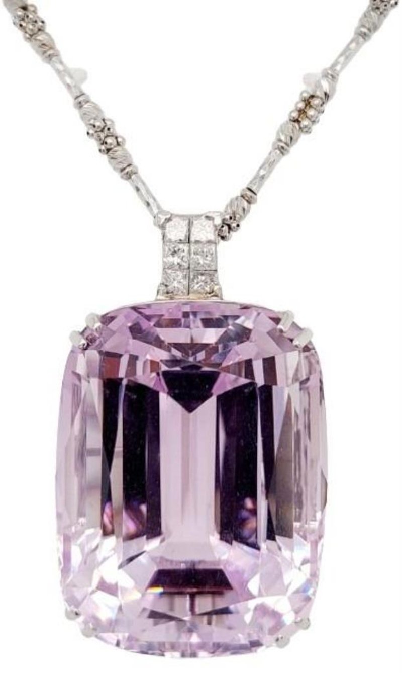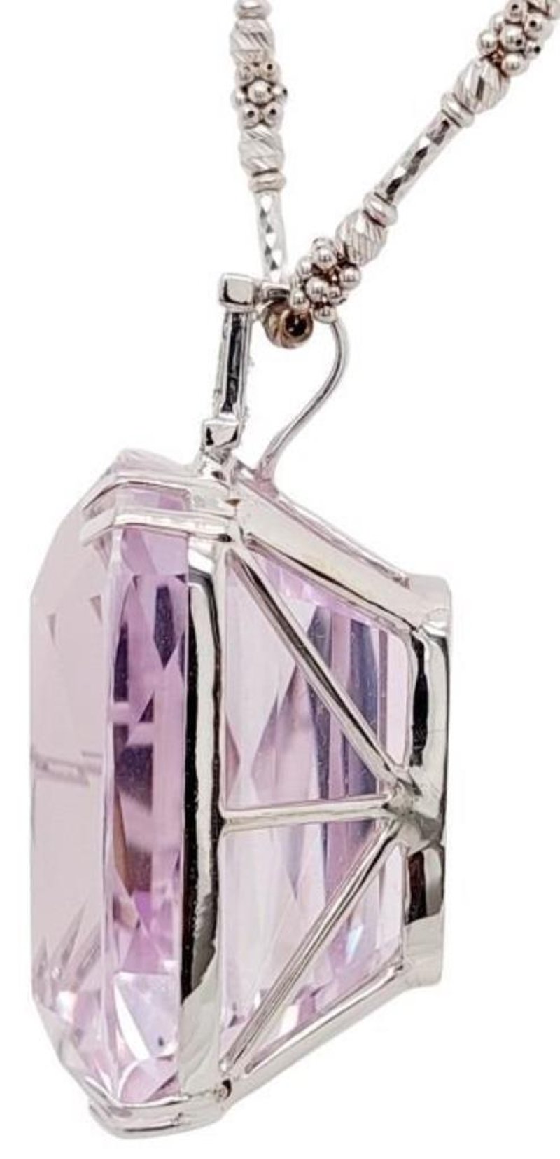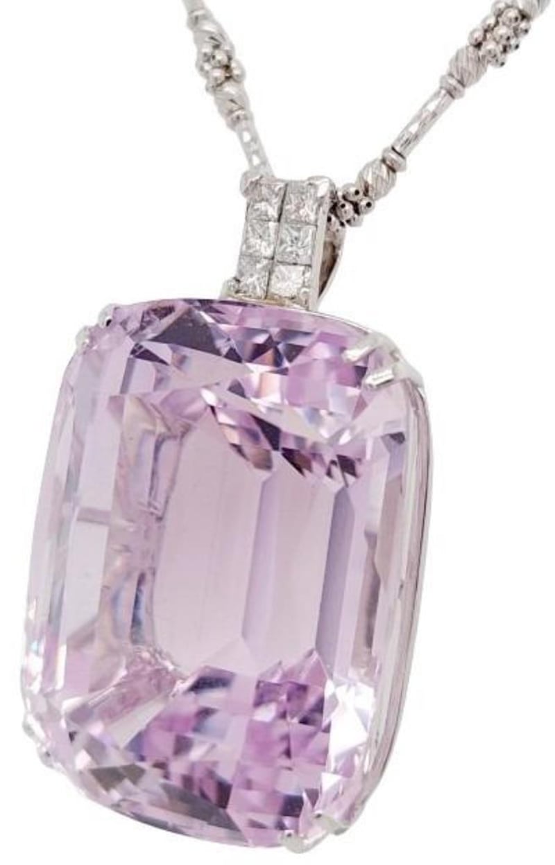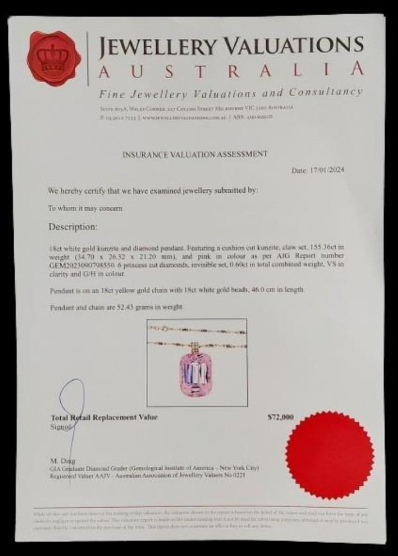 18CT WHITE GOLD KUNZITE AND DIAMOND PENDANT WITH 18CT WHITE GOLD BEADED CHAIN Total Item Weight: 52.43gms Size: 46cms This 18Ct White Gold Pendant Features 1 X 155.36Ct Cushion Cut Claw Set Kunzite, Measuring 34.70Mm X 26.32Mm X 21.20Mm And Pink In Colour As Per Aig Report Number Gem2023090798550. This Pendant Also Features 6 X Princess Cut Invisible Set Diamonds, 0.60Ct In Total Combined Weight, Vs In Clarity And G-H In Colour. Jewellery Valuations Provided By A Third Party Professional Not Directly Associated With Lloyds Auctions at AUD $72000This Insurance Valuation has been provided by a registered Jewellery Valuer and is intended for insurance purposes only. The valuation amount has no bearing on the auction value of the item. Any questions regarding the valuation should be directed to the issuing Valuer (refer to contact details on the certificate) as Lloyds have no association or relationship with the Valuer or the valuation amount contained within the valuation. Condition: Excellent- Refer Images 0162901+115CROSSDOCK