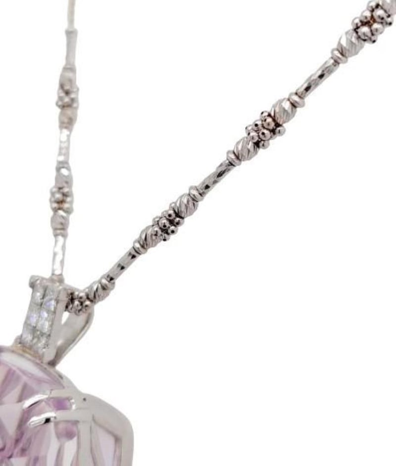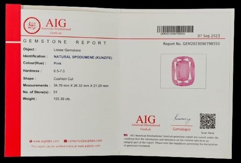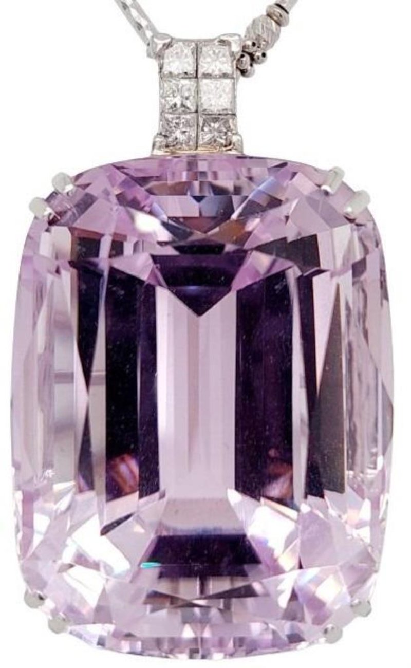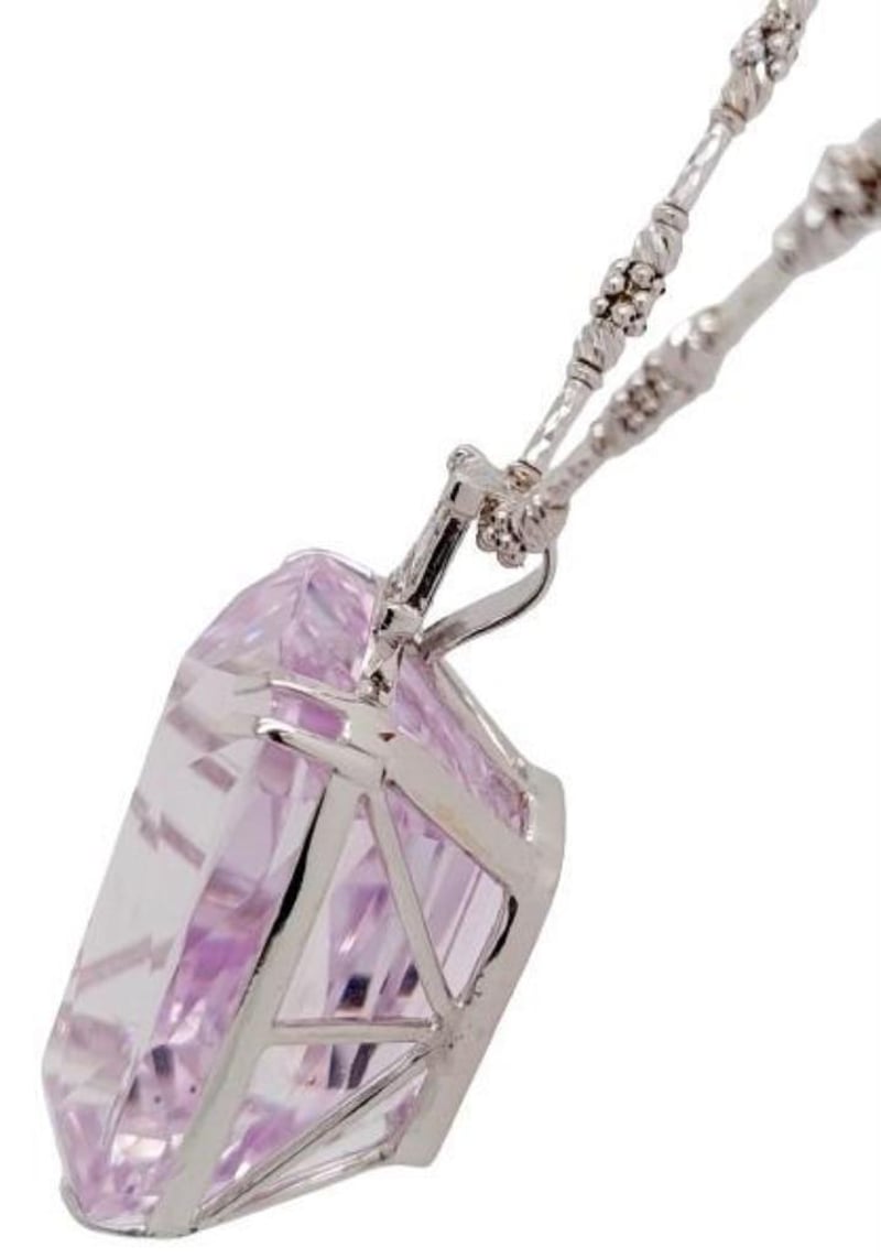 18CT WHITE GOLD KUNZITE AND DIAMOND PENDANT WITH 18CT WHITE GOLD BEADED CHAIN Total Item Weight: 52.43gms Size: 46cms This 18Ct White Gold Pendant Features 1 X 155.36Ct Cushion Cut Claw Set Kunzite, Measuring 34.70Mm X 26.32Mm X 21.20Mm And Pink In Colour As Per Aig Report Number Gem2023090798550. This Pendant Also Features 6 X Princess Cut Invisible Set Diamonds, 0.60Ct In Total Combined Weight, Vs In Clarity And G-H In Colour. Jewellery Valuations Provided By A Third Party Professional Not Directly Associated With Lloyds Auctions at AUD $72000This Insurance Valuation has been provided by a registered Jewellery Valuer and is intended for insurance purposes only. The valuation amount has no bearing on the auction value of the item. Any questions regarding the valuation should be directed to the issuing Valuer (refer to contact details on the certificate) as Lloyds have no association or relationship with the Valuer or the valuation amount contained within the valuation. Condition: Excellent- Refer Images 0162901+115CROSSDOCK