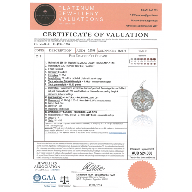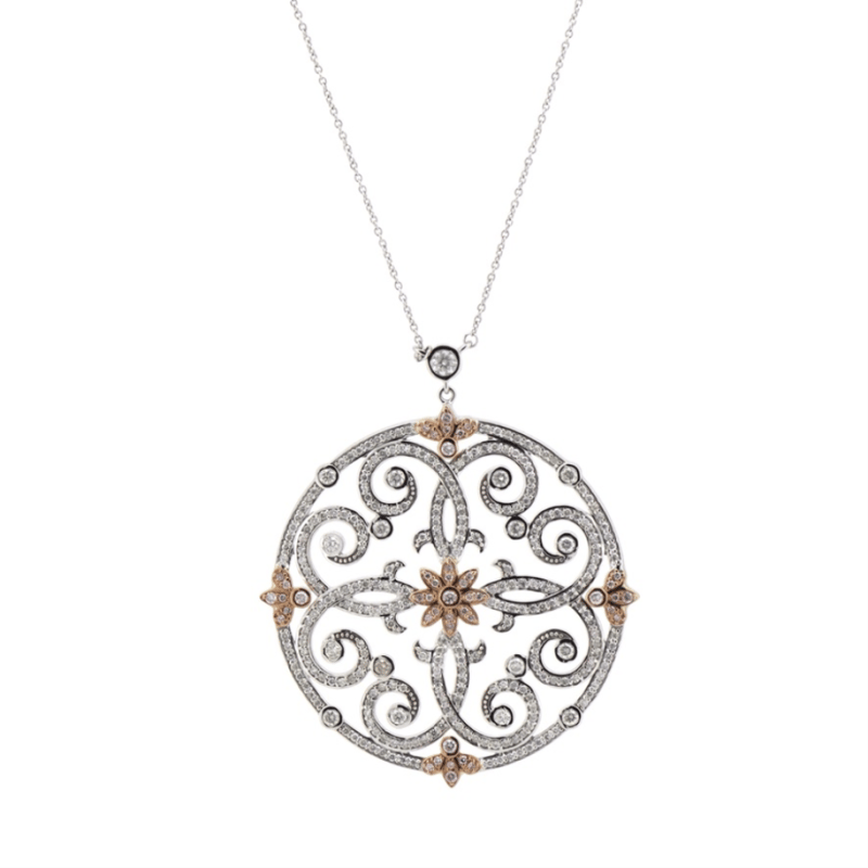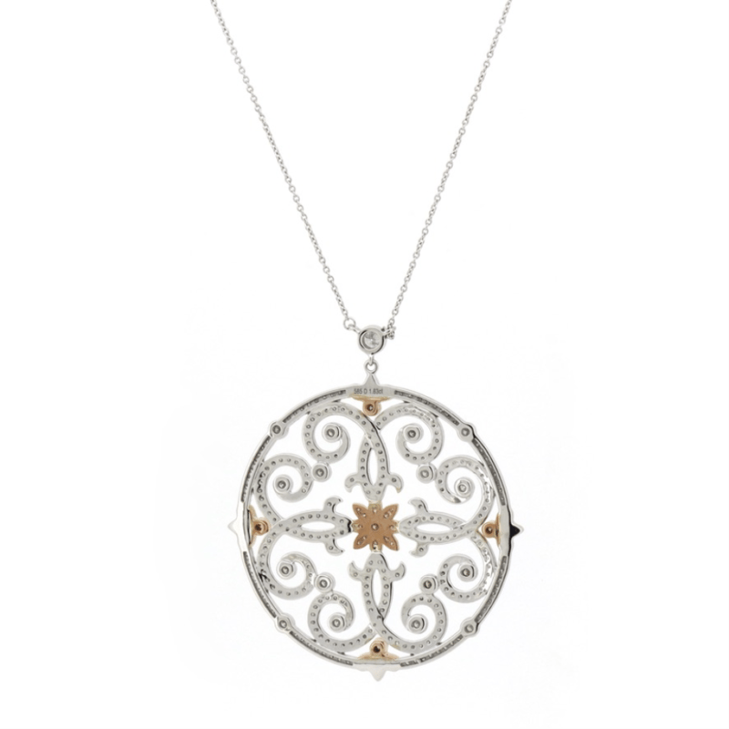 14K WHITE/ROSE GOLD, FANCY PINK DIAMOND AND DIAMOND, DECORATIVE NECKLACE. THE PENDANT FEATURES, 45 ROUND BRILLIANT CUT, FANCY BLUSH PINK, DIAMONDS (0.267CT TDW, SI1-SI2 CLARITY), BEZEL SET. ENCOMPASSING DESIGN ARE, 277 ROUND BRILLIANT CUT, DIAMONDS (1.563CT TDW, G-H COLOUR, SI1-SI2 CLARITY), ON A FINE CABLE LINK WITH A PARROT CLASP, LENGTH 22CM.