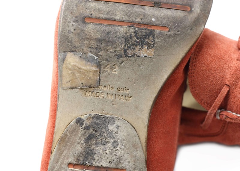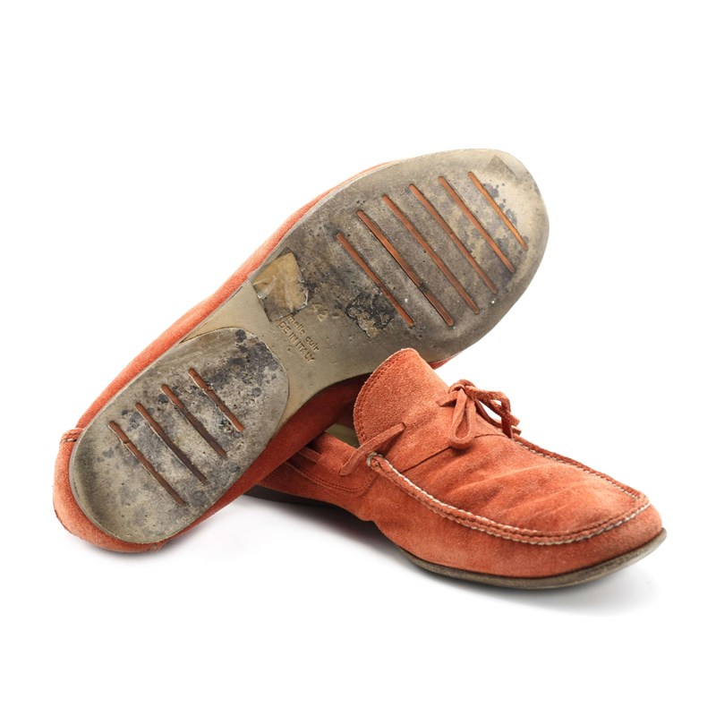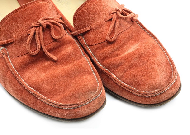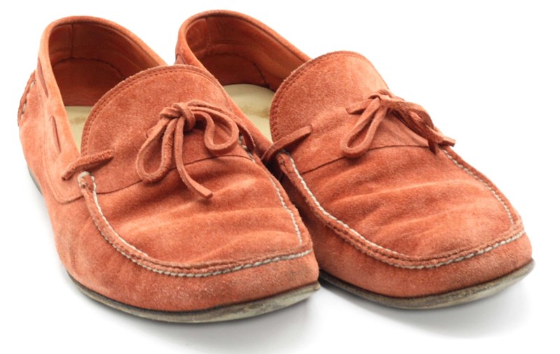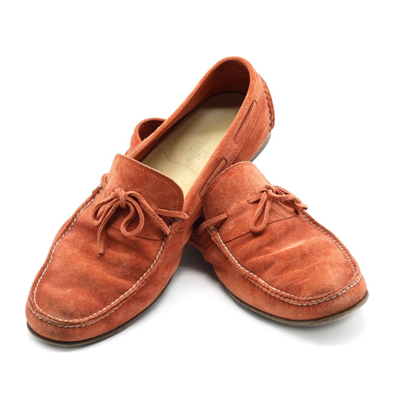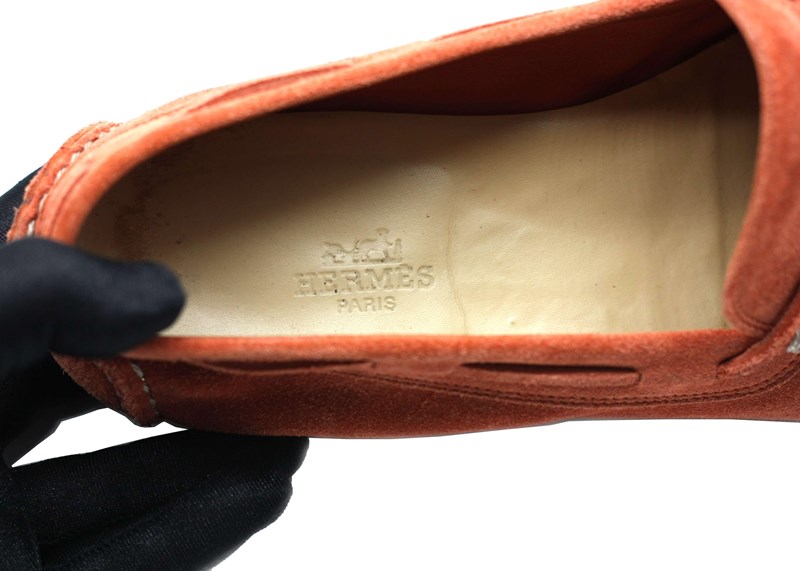 HERMÈS SUEDE BOW SLIP ON LOAFERS SIZE 42 MEN'SSize: DESIGNER 42 HERMES MEN'SMaterialOrange round-toe slip-on suede leather loafers with bow accents at vamps.Additional Condition Report- Significant wear and scratches throughout exterior- Visible wear, scratches and creases at insoles- Significant wear and scuffs at solesComes With- Original Dustbag- Box- Care Card- Certificate of Authenticity CROSSED DOCKED 155365+36