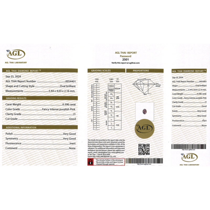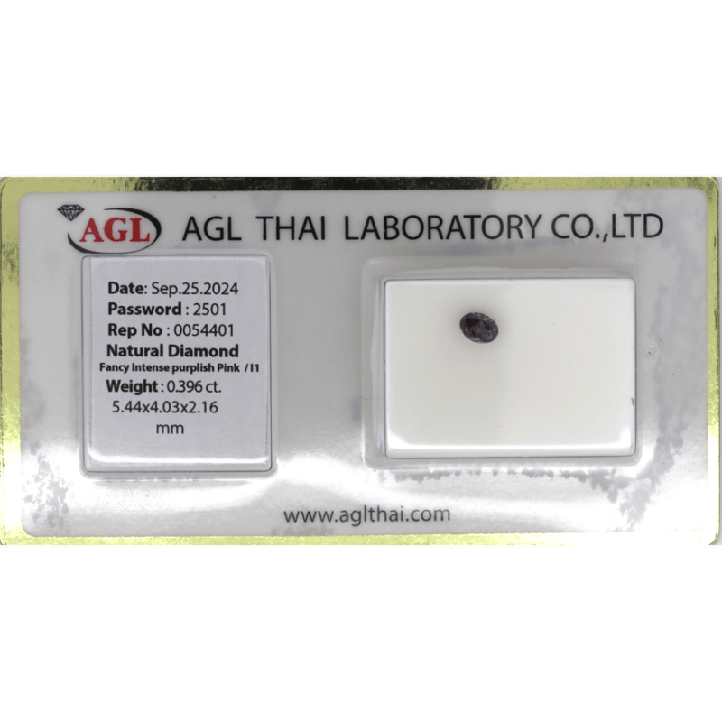0.396CT CERTIFIED, NATURAL FANCY PURPLE/PINK NATURAL DIAMOND, OVAL BRILLIANT CUT, FANCY INTENSE PURPLISH-PINK, I1 CLARITY, LOOSE, UNSET. Stone Comes Sealed With Agl Report: 0054401. Valuations Provided by an Independent Third-Party Professional Not Directly Associated With Lloyds Auctions at AUD $$26,000.00This valuation has been conducted by an independent third-party professional. The valuation amount is an assessment by the issuing valuer and does not reflect the auction value of the item. Any inquiries regarding the valuation should be directed to the issuing valuer (refer to contact details on the certificate), as Lloyds Auctions has no affiliation or influence over the valuation, the valuer, or the stated amount. Condition: Good - Refer Images 0645848+3222