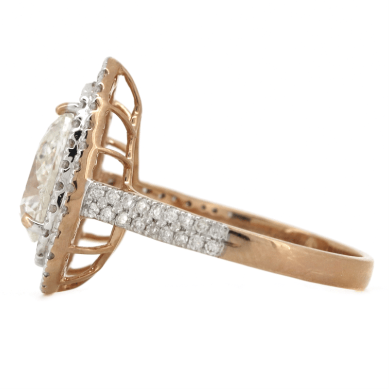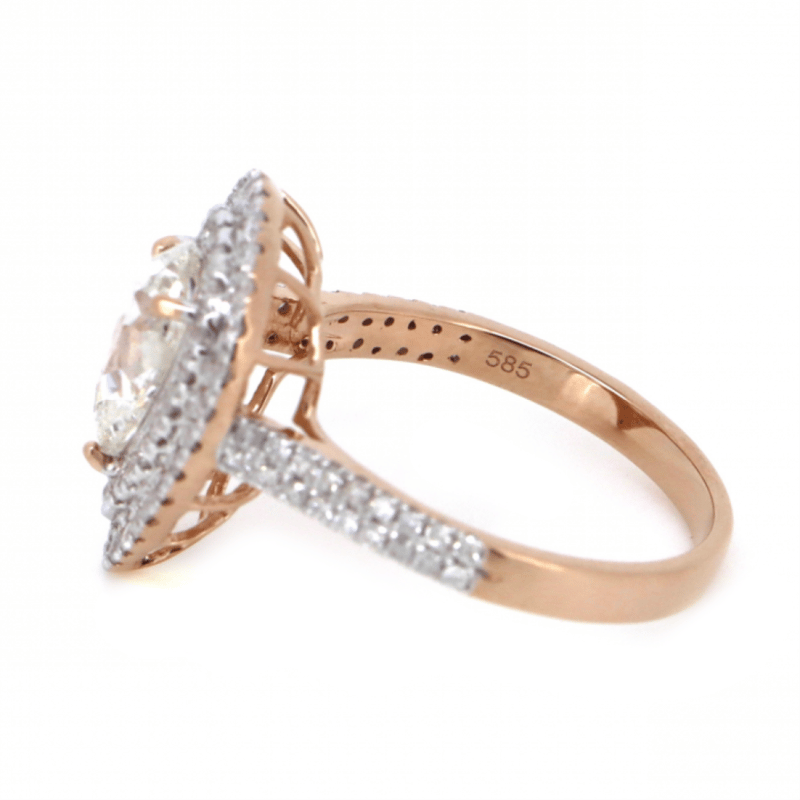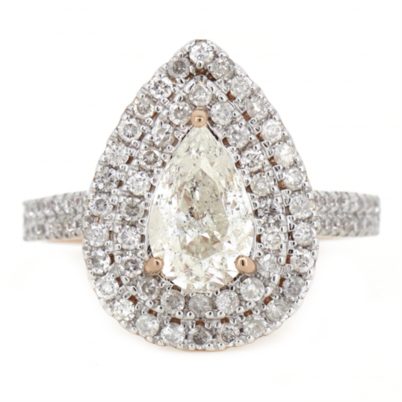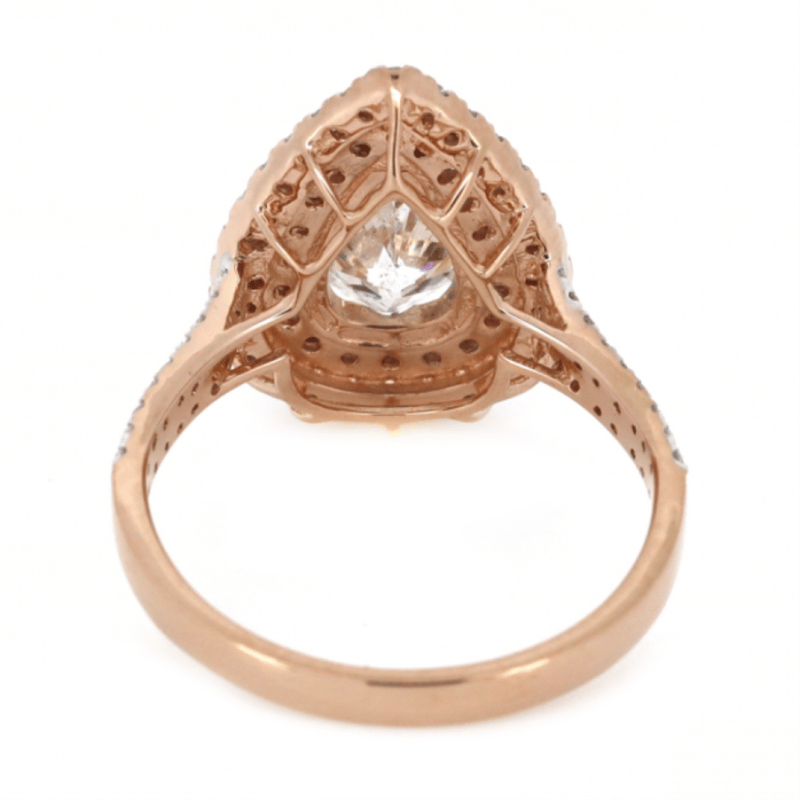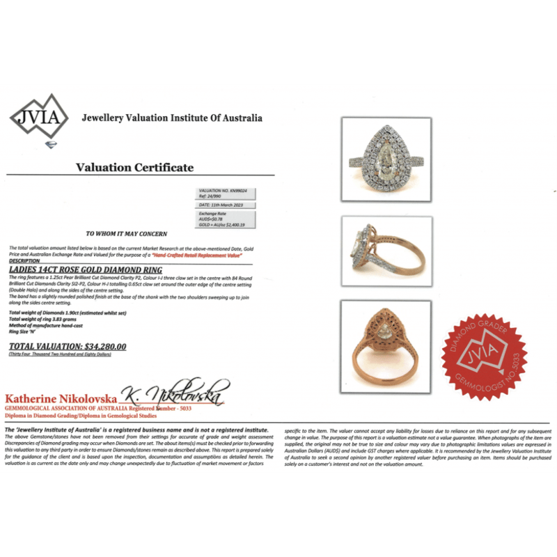 14K ROSE GOLD AND DIAMOND, DOUBLE HALO RING. The Centre Features, One Pear Brilliant Cut, Diamond (1.25Ct, I-J Colour, P2 Clarity), Claw Set. Surrounding The Centre In A Double Halo And Decorating The Band Are, 84 Round Brilliant Cut, Diamonds (0.65Ct Tdw, H-J Colour, Si2-P2 Clarity), Claw Set. Ring Size N. Valuations Provided by an Independent Third-Party Professional Not Directly Associated With Lloyds Auctions at AUD $$34,280.00This valuation has been conducted by an independent third-party professional. The valuation amount is an assessment by the issuing valuer and does not reflect the auction value of the item. Any inquiries regarding the valuation should be directed to the issuing valuer (refer to contact details on the certificate), as Lloyds Auctions has no affiliation or influence over the valuation, the valuer, or the stated amount. Condition: Good - Refer Images 0645848+3279