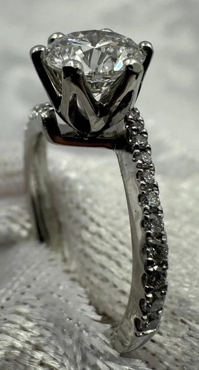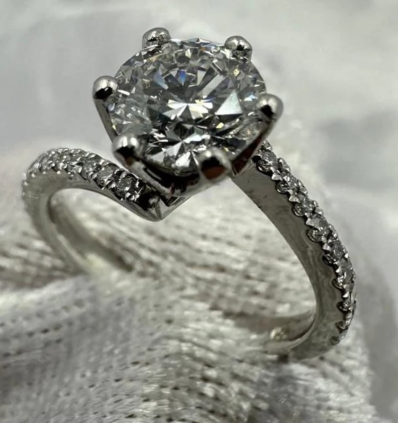 18K WHITE GOLD TWIST BAND RING WITH CERTIFIED CENTRE DIAMONDShape: Round Brilliant Specs: 1.00 Ct E/Vs2 Ex/Ex/Ex Medium Fluorescence 100% Eye Clean And Non Cloudy Setting: 18K White Gold Ring 22 X 0.005-0.025Ct Round Diamonds On The Band Diamond Quality: F/Si Minimum Total Carat Weight On Band= 0.33 Carats Approx Size HCert# Gia2195499987Condition: Good - Refer To ImagesCROSSDOCK162955+38