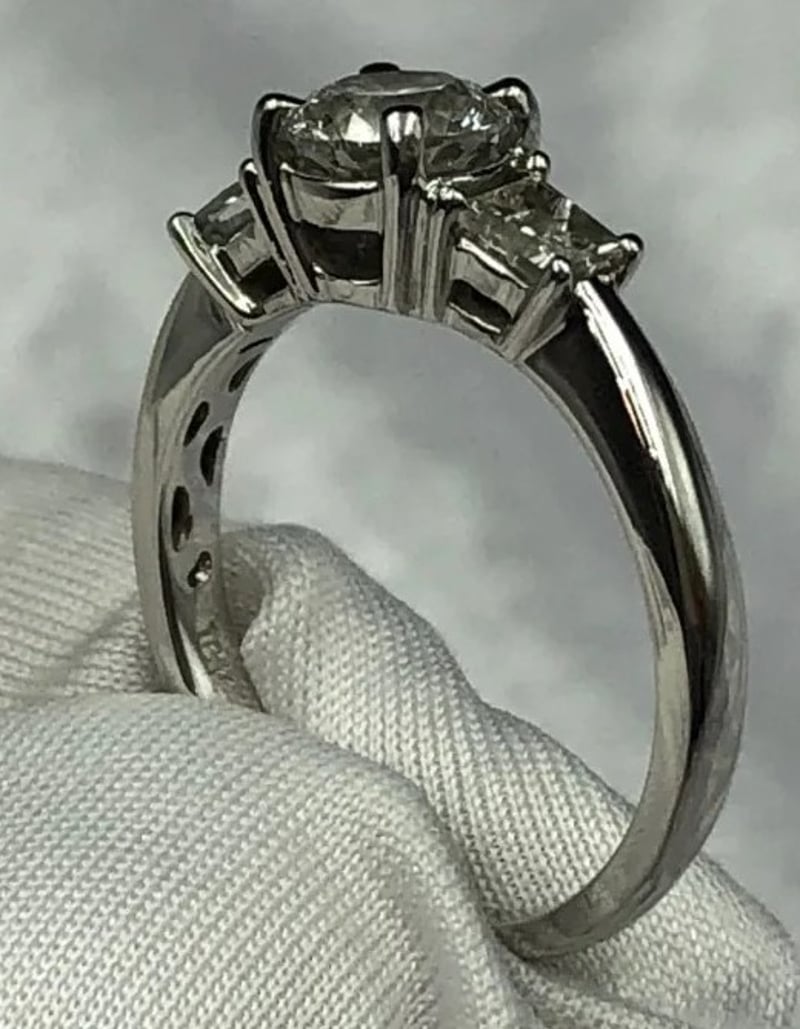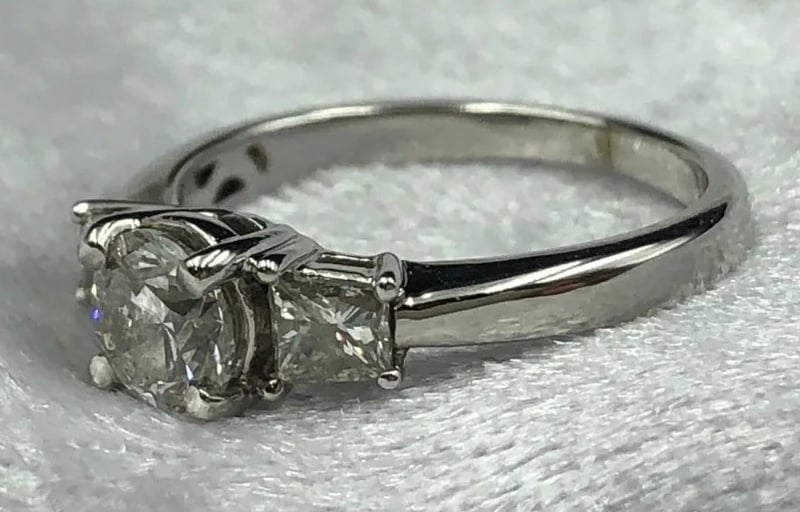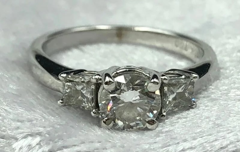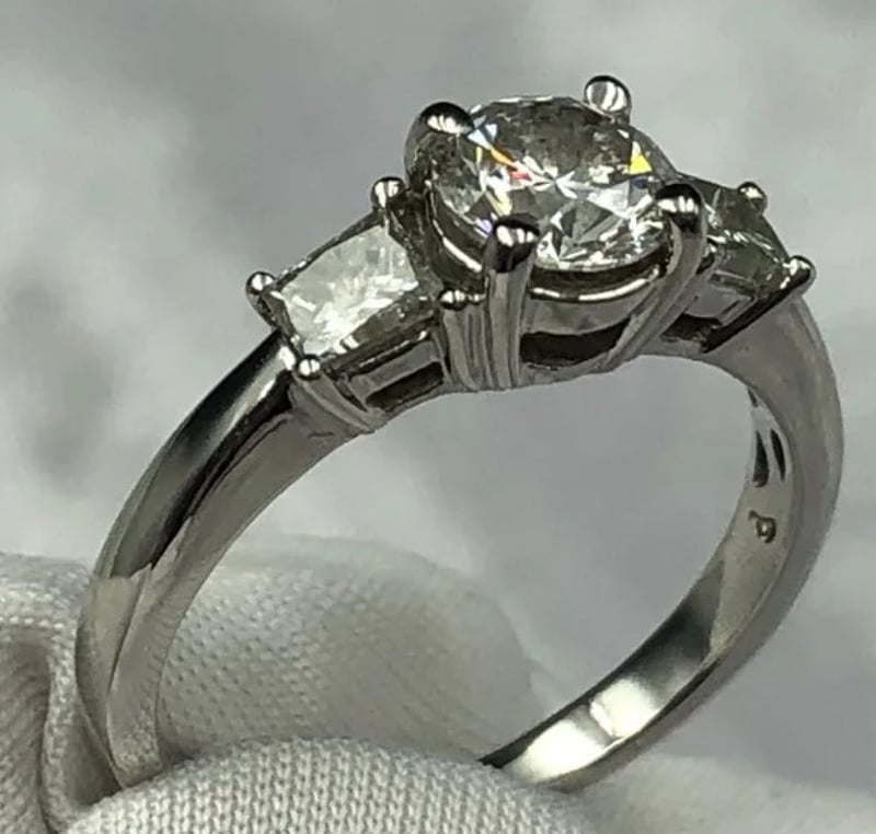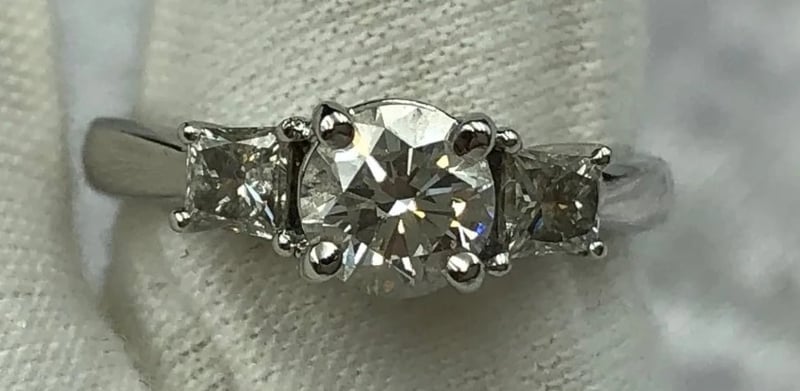 THREE STONE NATURAL DIAMOND ENGAGEMENT RING0.62 Ct Approx Centre Round Brilliant Diamond. F/Vs1 Minimum Quality. 2 X 0.19 Ct Approx Tapered Princess Cut Stones, F/Vs2 Minimum Quality. Set In 18K White Gold Ring. Total Carat Weight Of 1.00 Ct Approx Ring Size: L Comes With A Valuation From Robert H Parker And Sons. Valued At $9520Condition: Good - Refer To ImagesCROSSDOCK162955+28