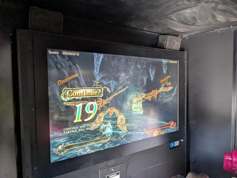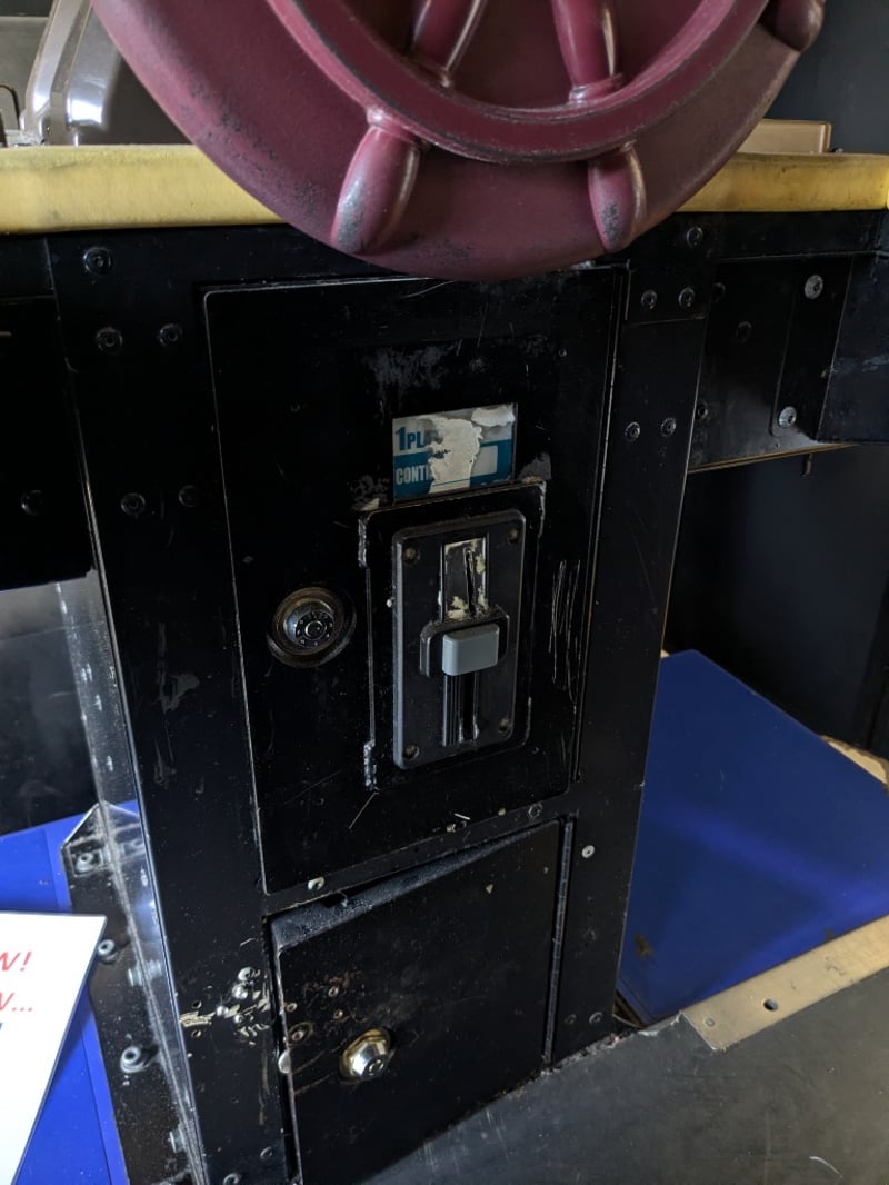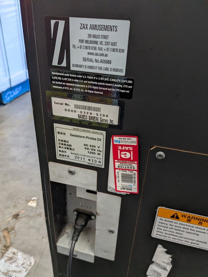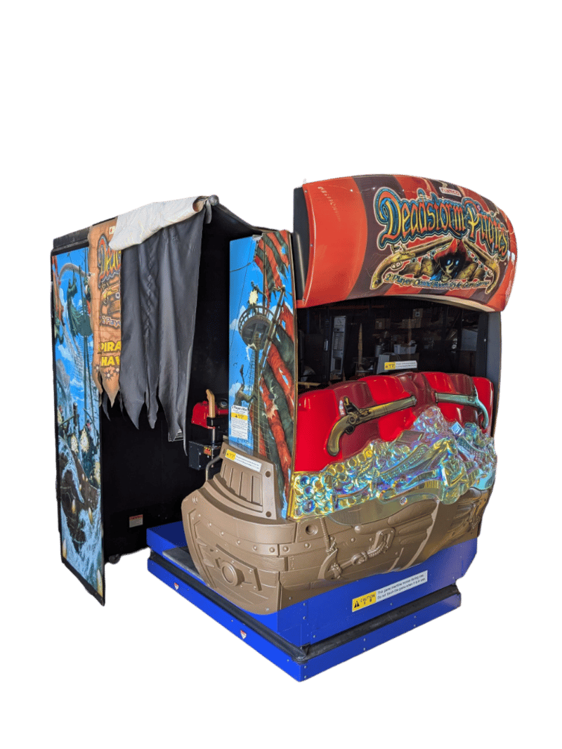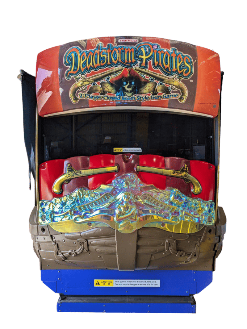 Namco Dead Storm Pirates DX Arcade MachineMake: Nanco Bandai Games Inc. JAPANModel: Closed booth styleS/N: 00003295700Description: 2 players closed booth style gun games, , Power cable, Coin mechanism, Signs of wear, Machine turns onVendor Advises: Game turns on and is working – no motion – game boots up – screen turns on – both guns shoot accurately as they should – sound workingApproximate Dimensions: 213cm (H) x 184cm (W) x 250cm (D)