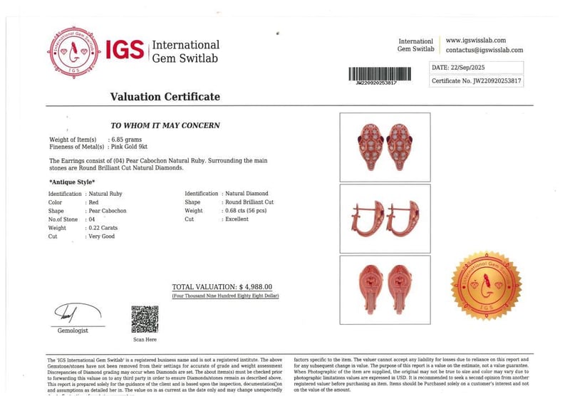 9CT PINK GOLD DIAMOND AND RUBY EARRINGS Date : 11/09/2025 Category: Earring Comment: 9Kpg Natural Diamond : 0.68 Ct ( 56 Pcs.) Natural Ruby: 0.45 Ct/0.22 Ct ( 4 Pcs.) Item Weight : 6.85 G Condition: Good - Refer Images 253817 488284+253817