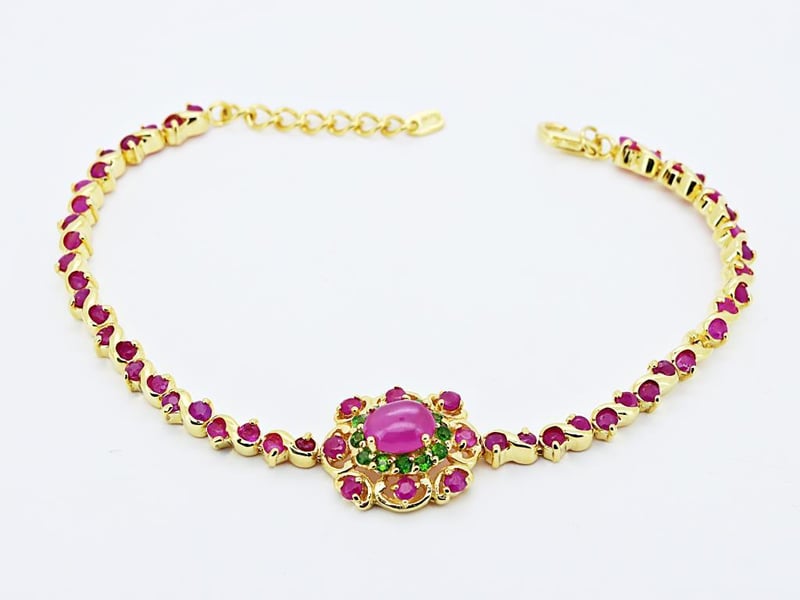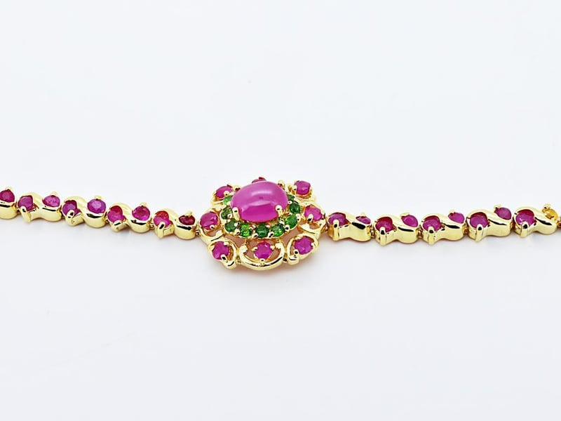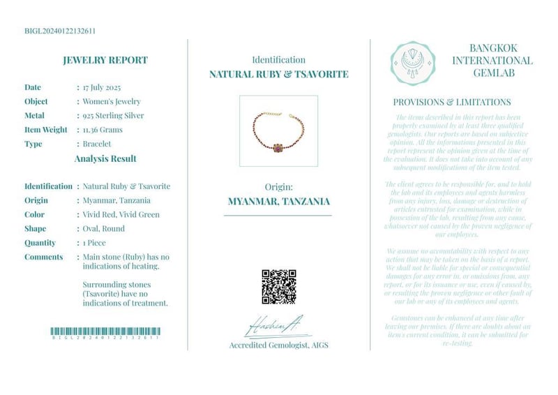 NATURAL RUBY & TSAVORITE BRACELET ON 925 SILVER - WITH DIGITAL CERTIFICATE ONLY Gemstone : Natural Ruby & TsavoriteCertificate (Digital): Bigl20240122132611Item Total Weight : 11.36 GramsMain Stone Color : Vivid Red, Vivid GreenSize : Comments : Main Stone (Ruby) Has No Indications Of Heating.Surrounding Stones (Tsavorite) Have No Indications Of Treatment.✻ Verify Report Online At Www.Bangkokinternationalgemlab.Co Condition: Good - Refer Images 01611137+10